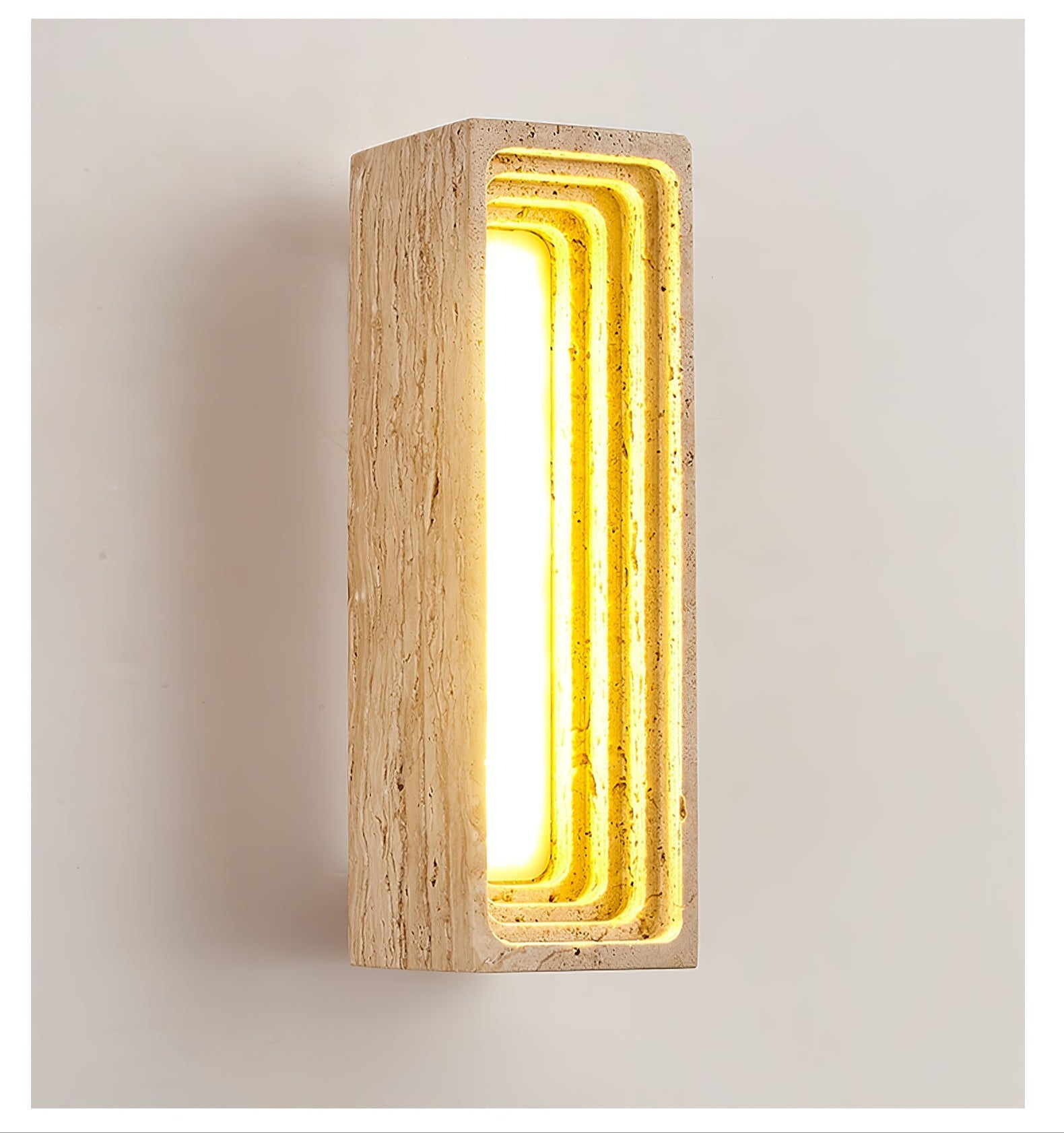 The sunweartfurniture Canyon Glow Wall Sconce channels the quiet majesty of natural rock formations with a modern, architectural edge. Carved from solid travertine stone, its tiered interior mimics the layered walls of a canyon, where warm light seeps through like sunlight at dusk. The linear design and textured finish make it a bold yet calming presence in hallways, living rooms, or contemporary retreats. With its interplay of depth, shadow, and golden glow, Canyon Glow is more than a light—it's a sculptural ode to nature’s geometry, crafted to elevate your space with timeless elegance.