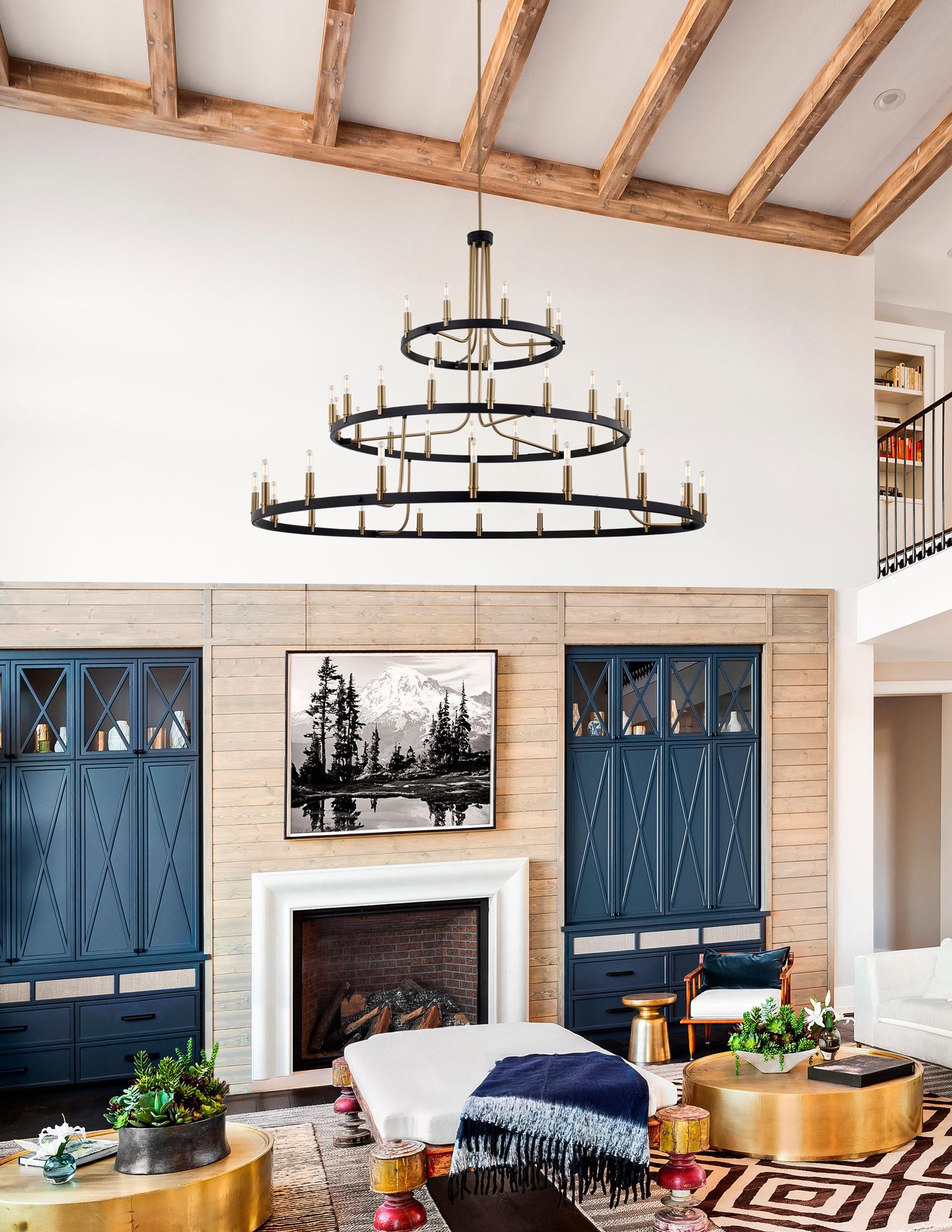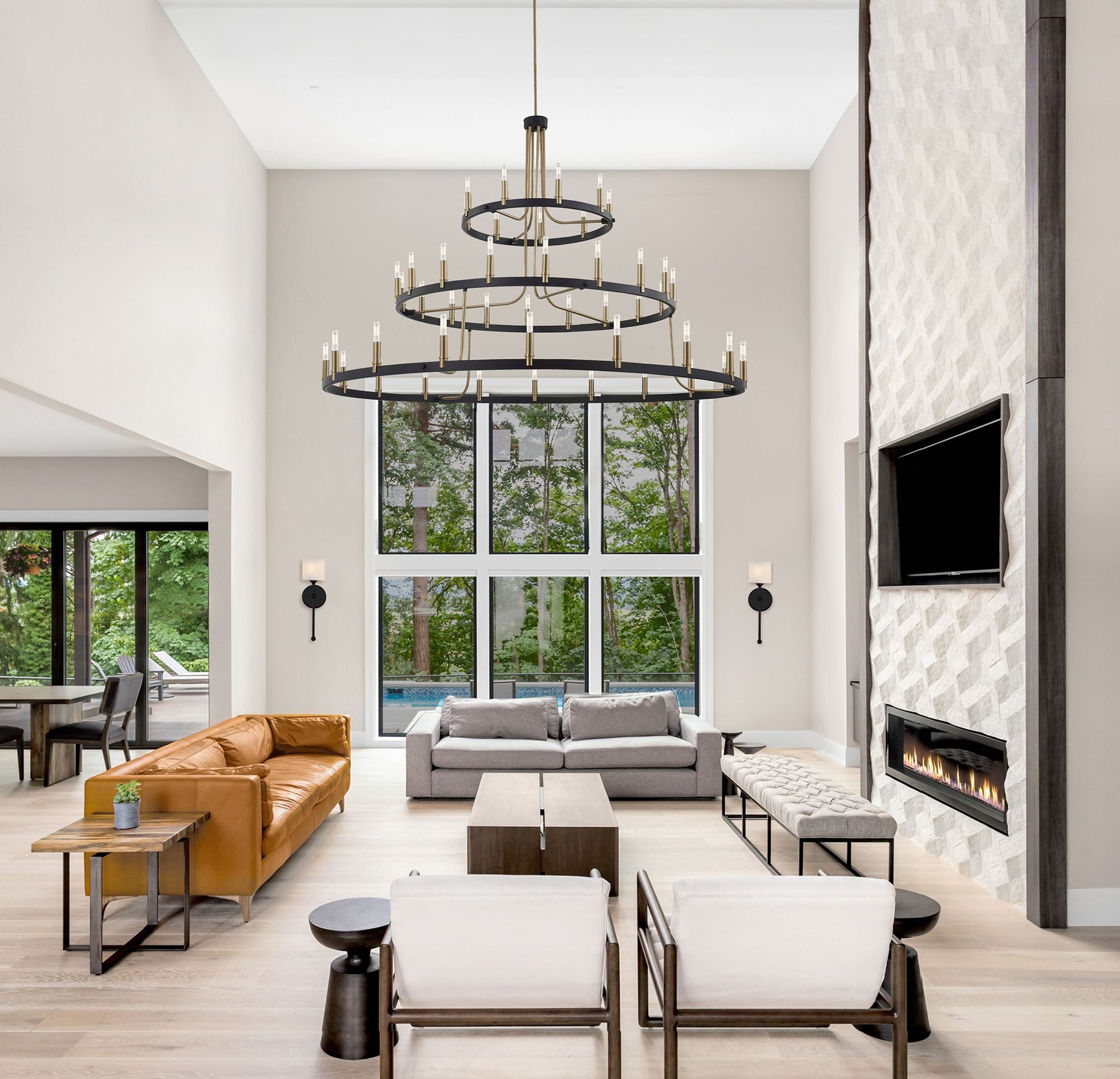 • Modern industrial 45-light three-tier chandelier from the Clayton