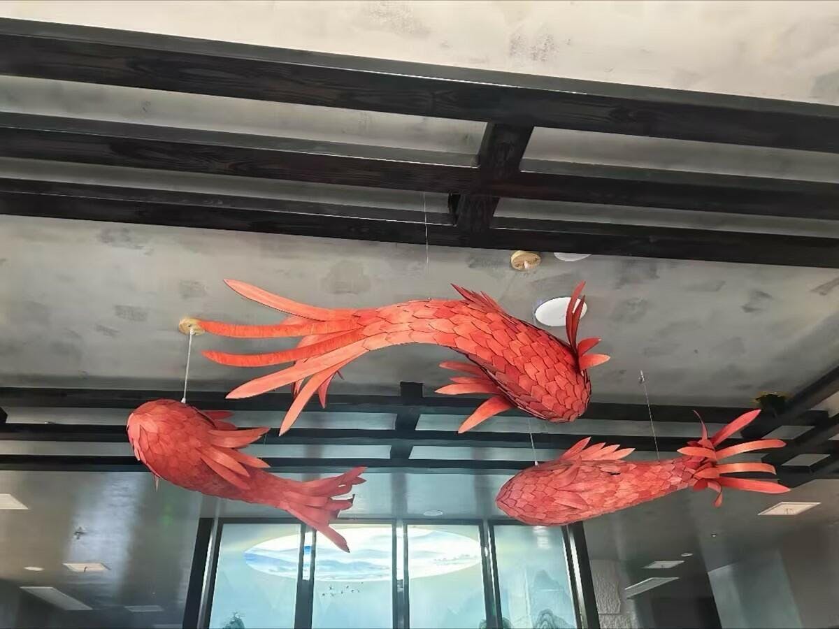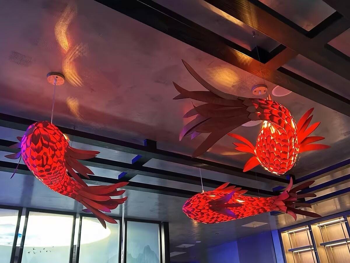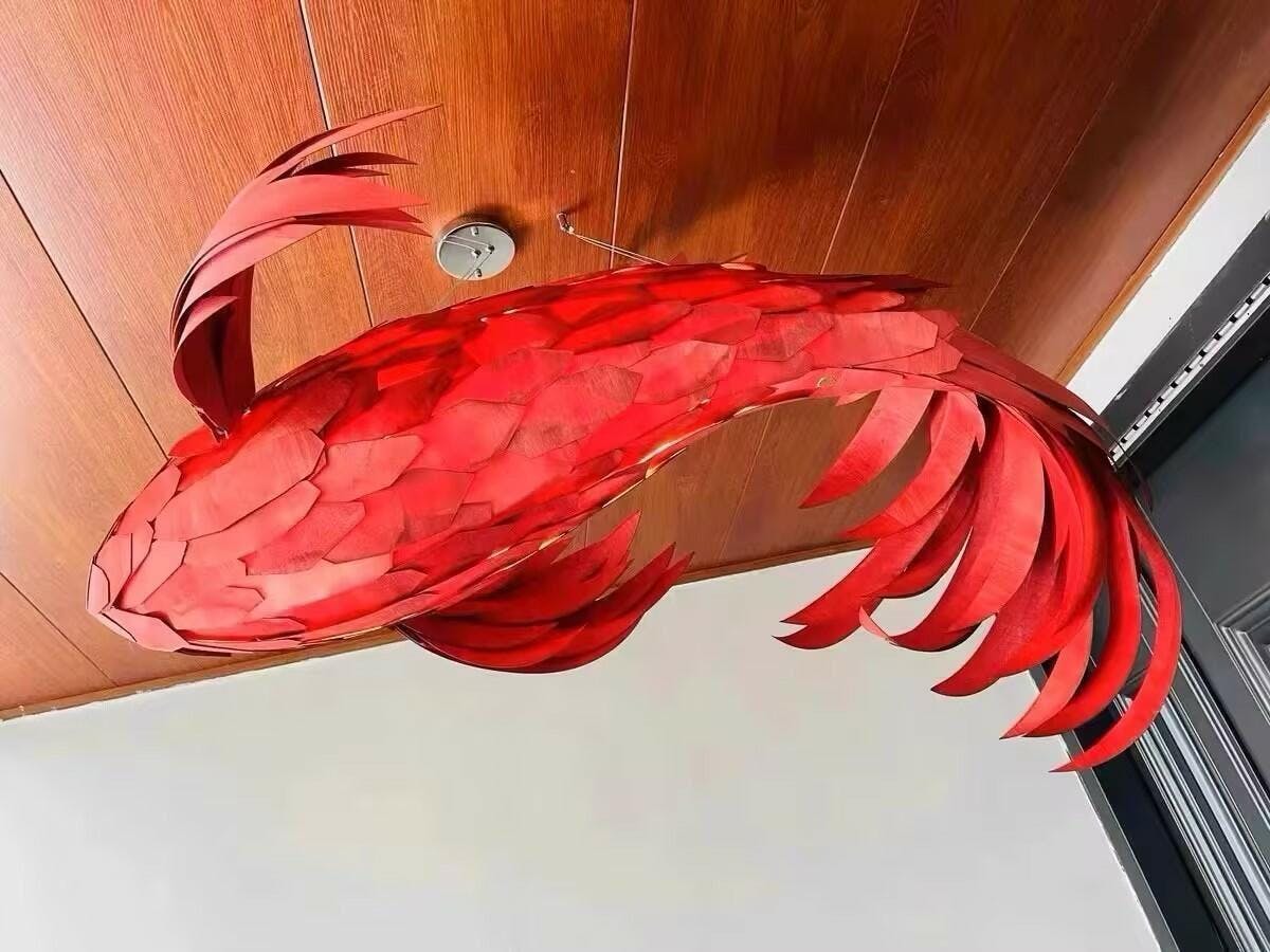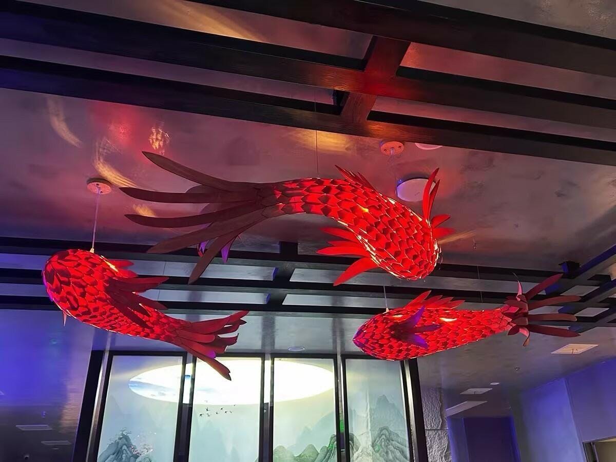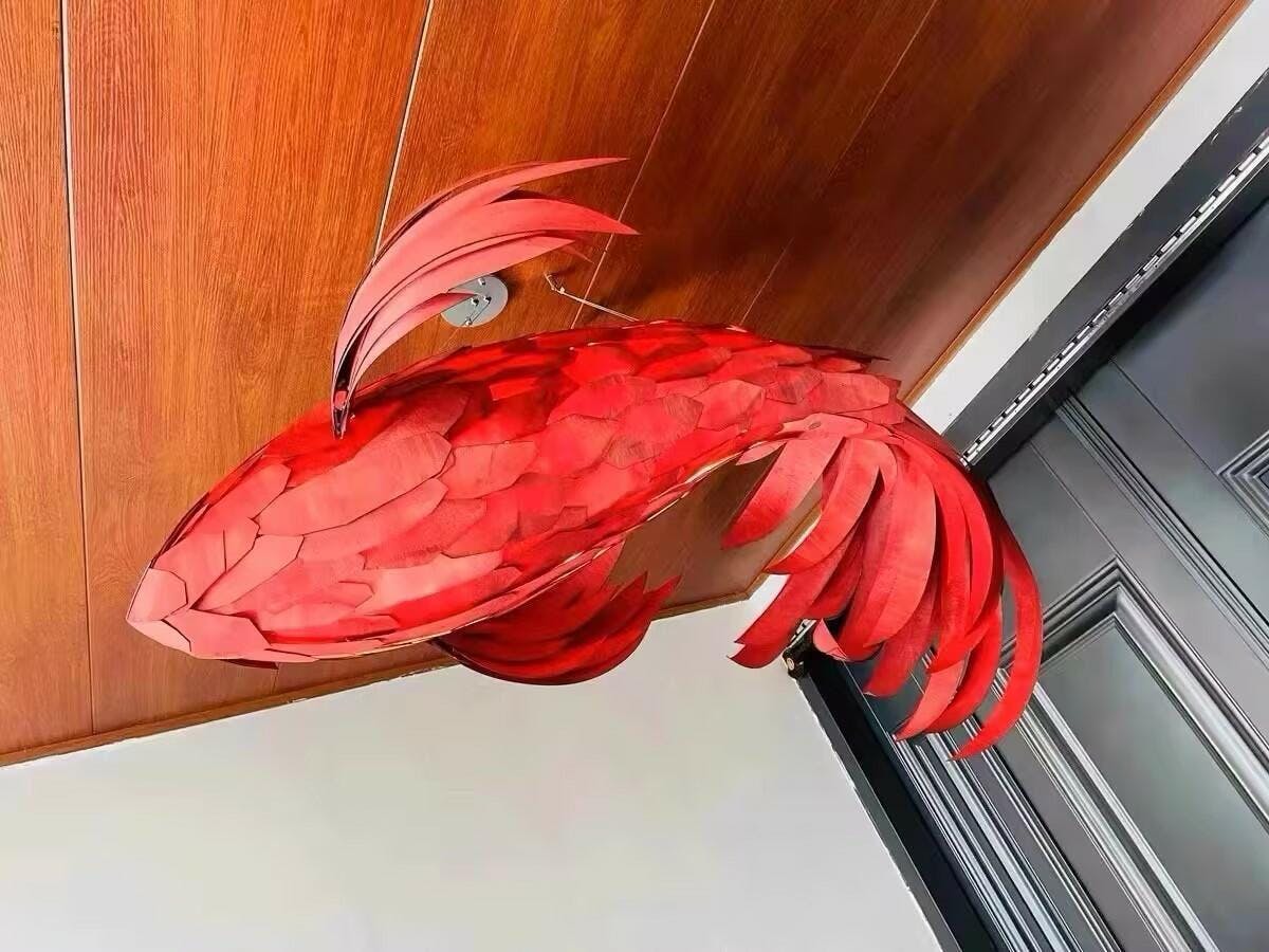 Capture the elegant fluidity of beloved koi with our Crimson Swirl Koi Chandelier. Crafted from finely layered and curved wood panels, this exquisite chandelier mirrors the dynamic movements and rich hues of these graceful fish in water. Paired with polished hardware for durability and easy installation, it seamlessly blends nature and craftsmanship. The warm glow from the wooden fins creates a mesmerizing pattern, evoking the sun dancing beneath the water's surface. A perfect choice for adding an organic touch to modern interior decor, make this chandelier the centerpiece of your space and bask in its serene and cozy ambiance.