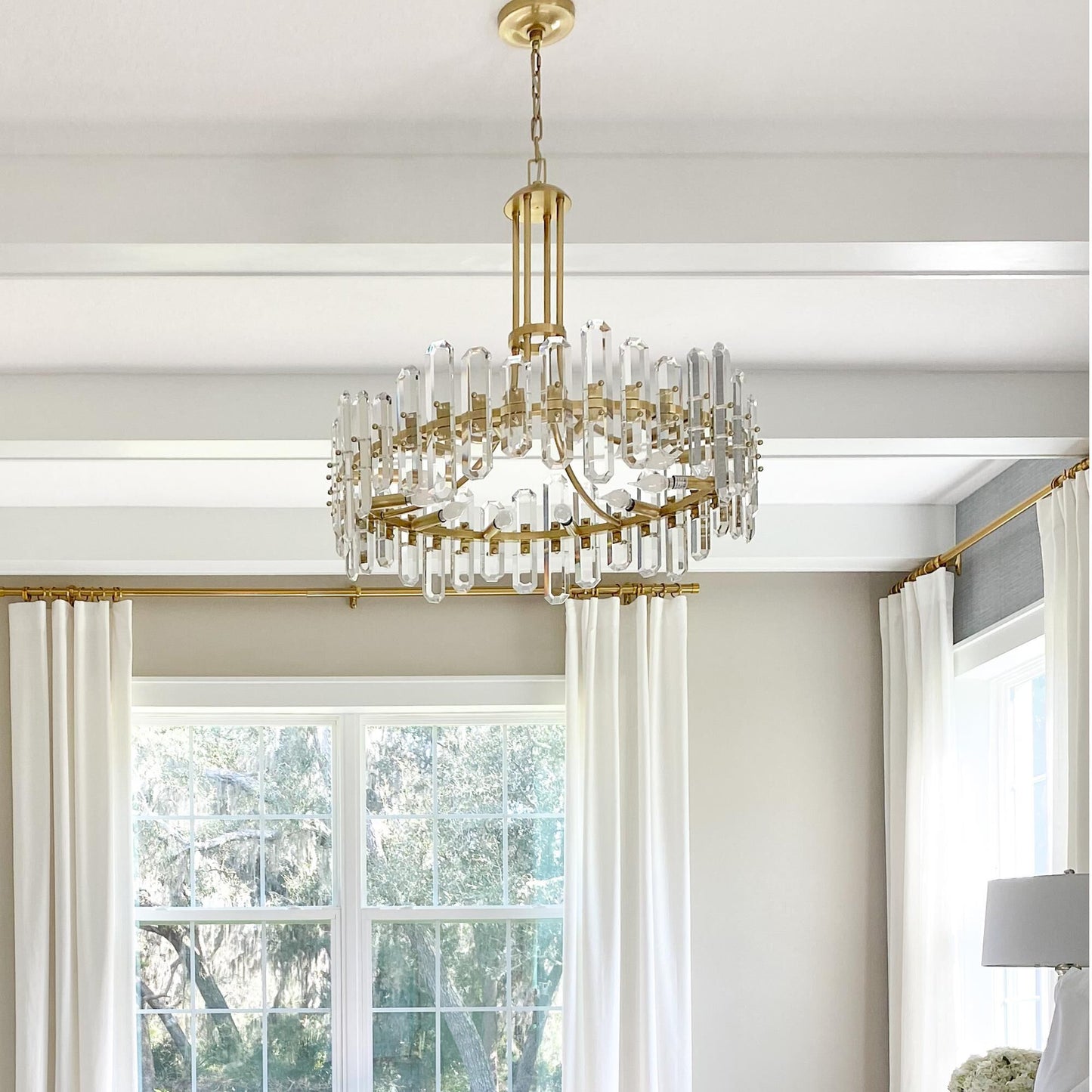 The Bolton Collection exudes glamour and luxury when placed as a focal point in the room. The varying sized faceted cut crystal panels are secured to a floating steel frame. The unique crystal prisms reflect beautiful light that creates an endless sparkle that elegantly blend with many home dcor styles.