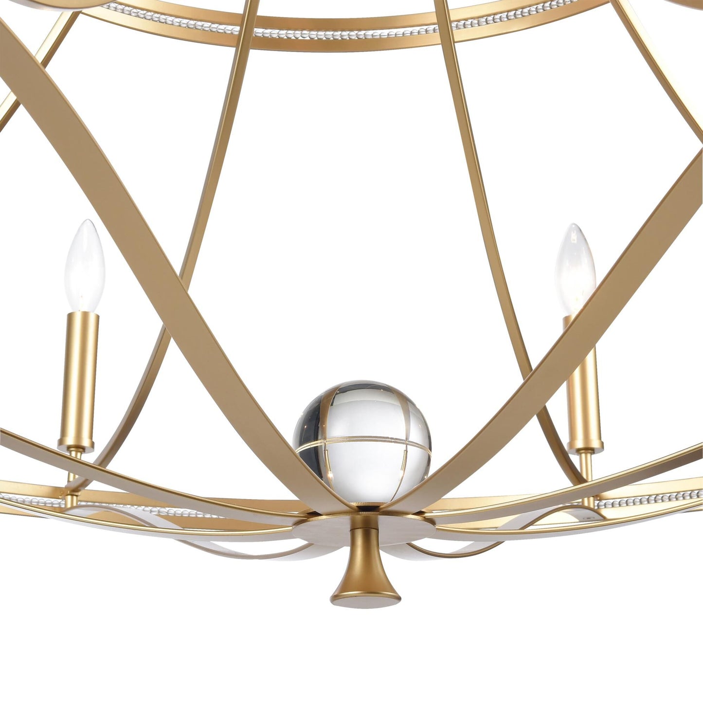 The Noura collection has an elegant traditional design with metalwork that flows from one element to the other. Clear glass beads highlight the center of the ring, and a clear glass ball becomes a focal point at the bottom of fixture.