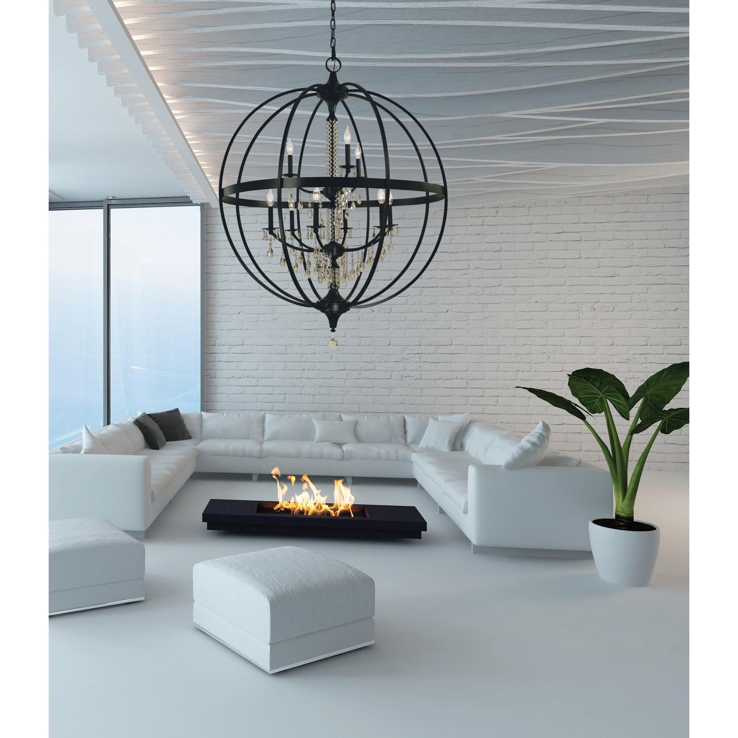 Square horizontal tubing surrounds a transitional frame adorned with crystal. All Framburg lighting products are hand made in the USA.