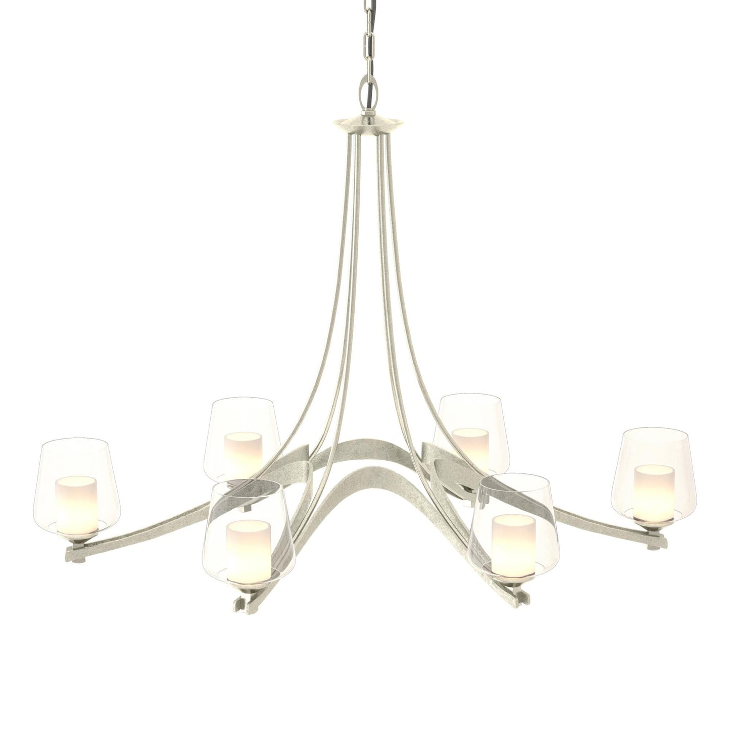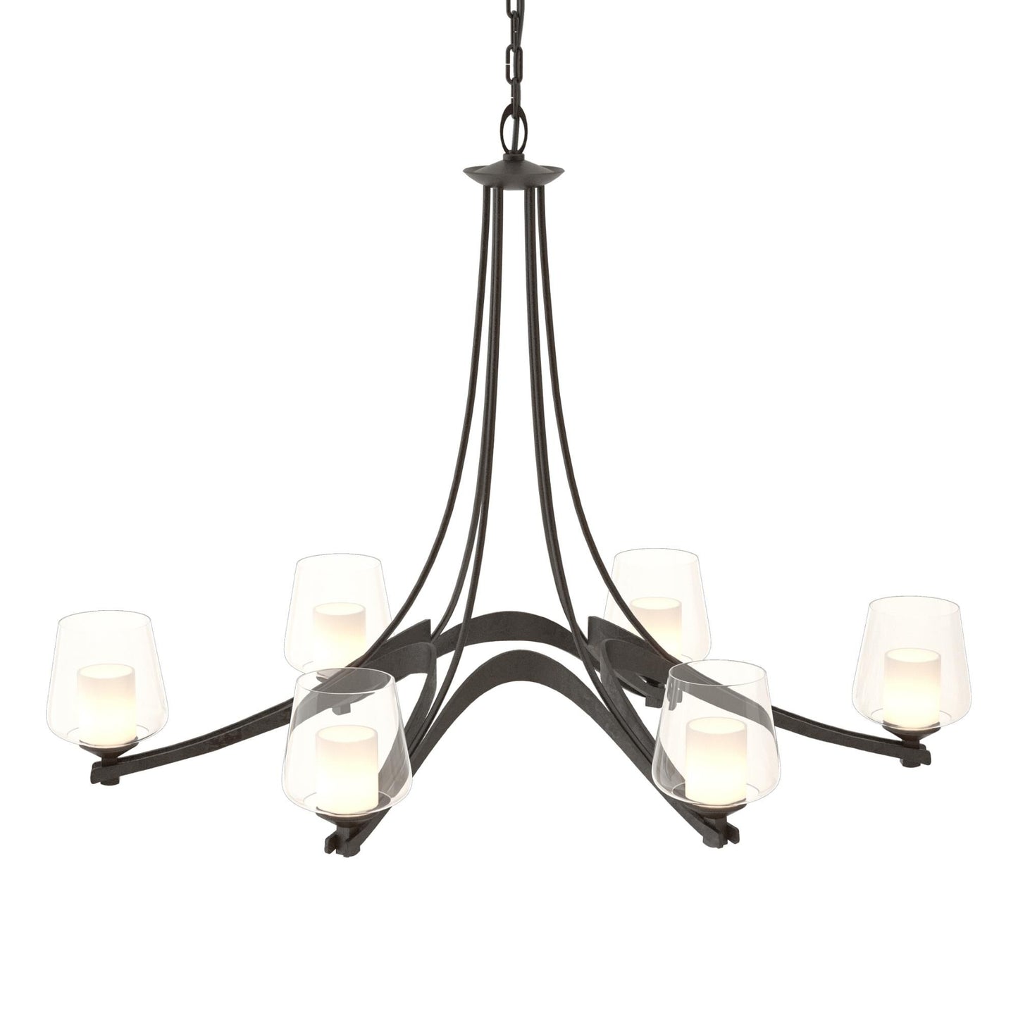 The flowing, hand-forged steel ribbons of our six-armed Ribbon Chandelier crescendo midway between each pairing of glass dome over glass tube. Delicate steel pipes hold the piece to complete the composition. All Hubbardton Forge products are hand-crafted to last one at a time in Vermont and backed by a Lifetime Limited Warranty.