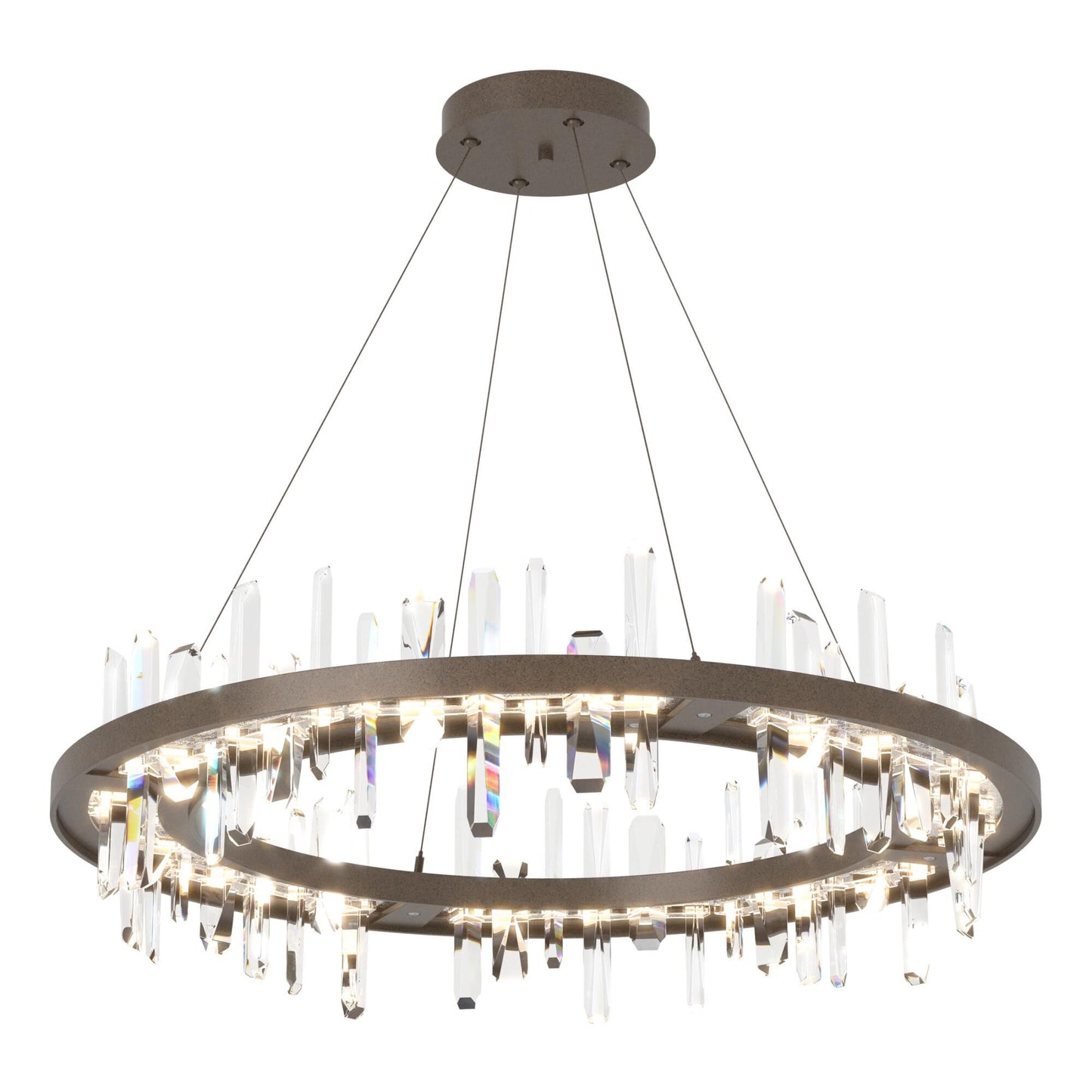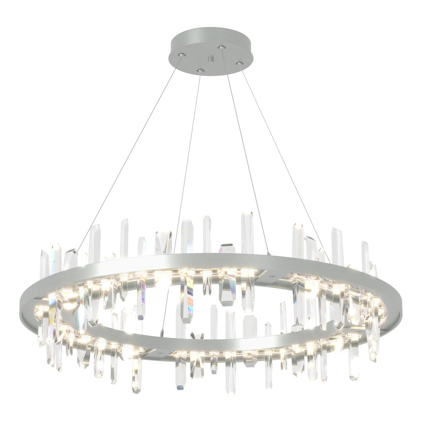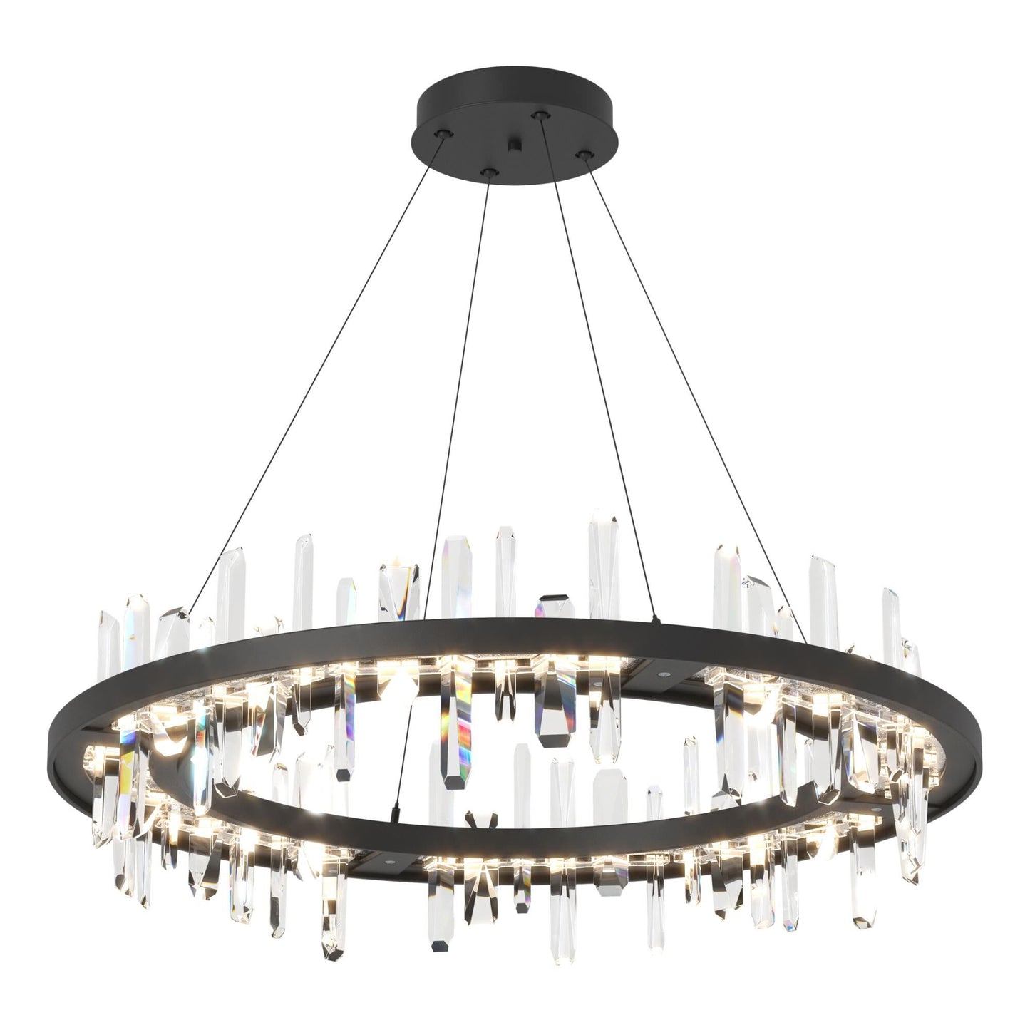 A floating ring of angular crystal towers provides the visual impact for this distinctive large scale pendant. Each crystal rises from an LED light guide and pierces through to emerge below, reflecting and refracting light in a vibrant sparkle. All Hubbardton Forge products are hand-crafted to last one at a time in Vermont and backed by a Lifetime Limited Warranty.