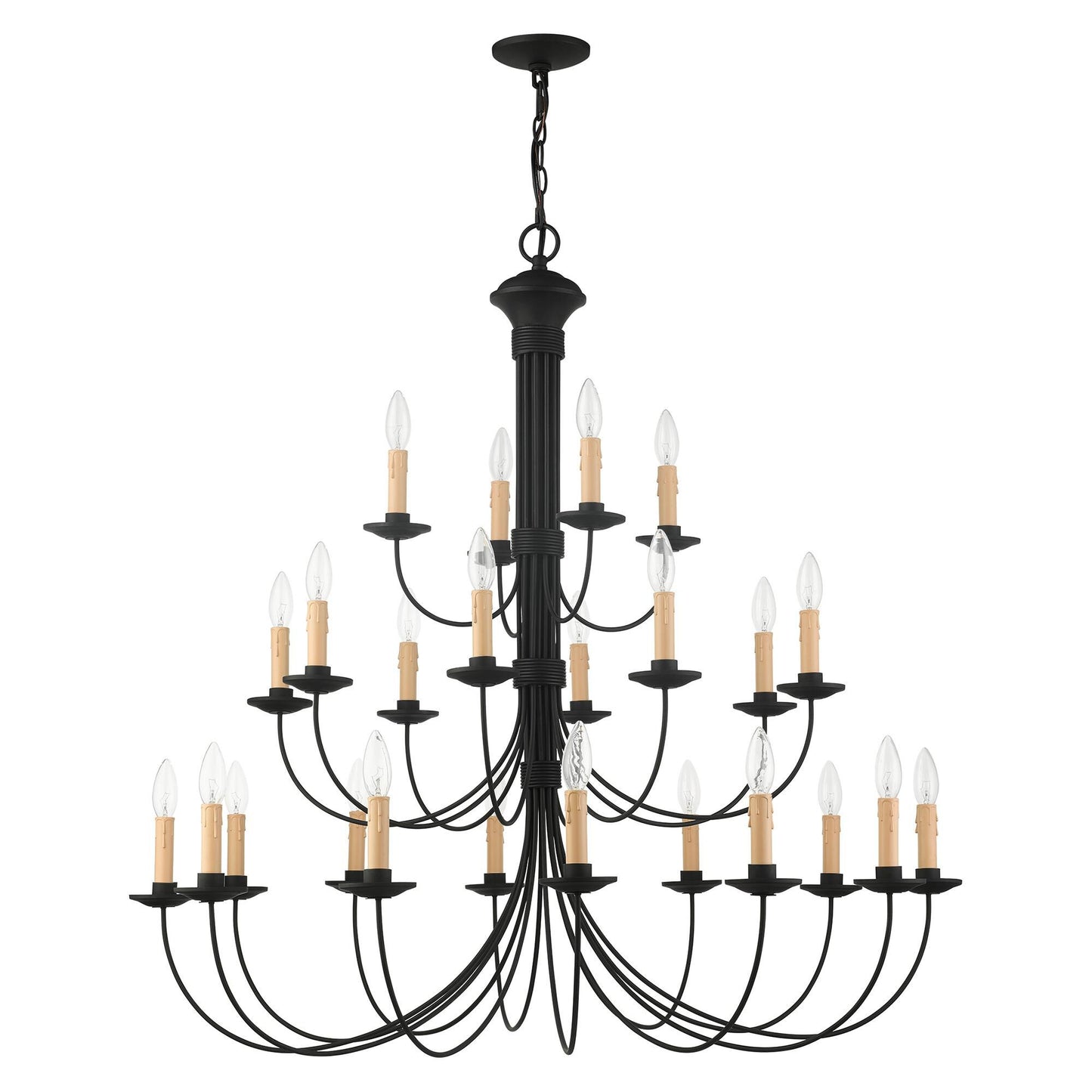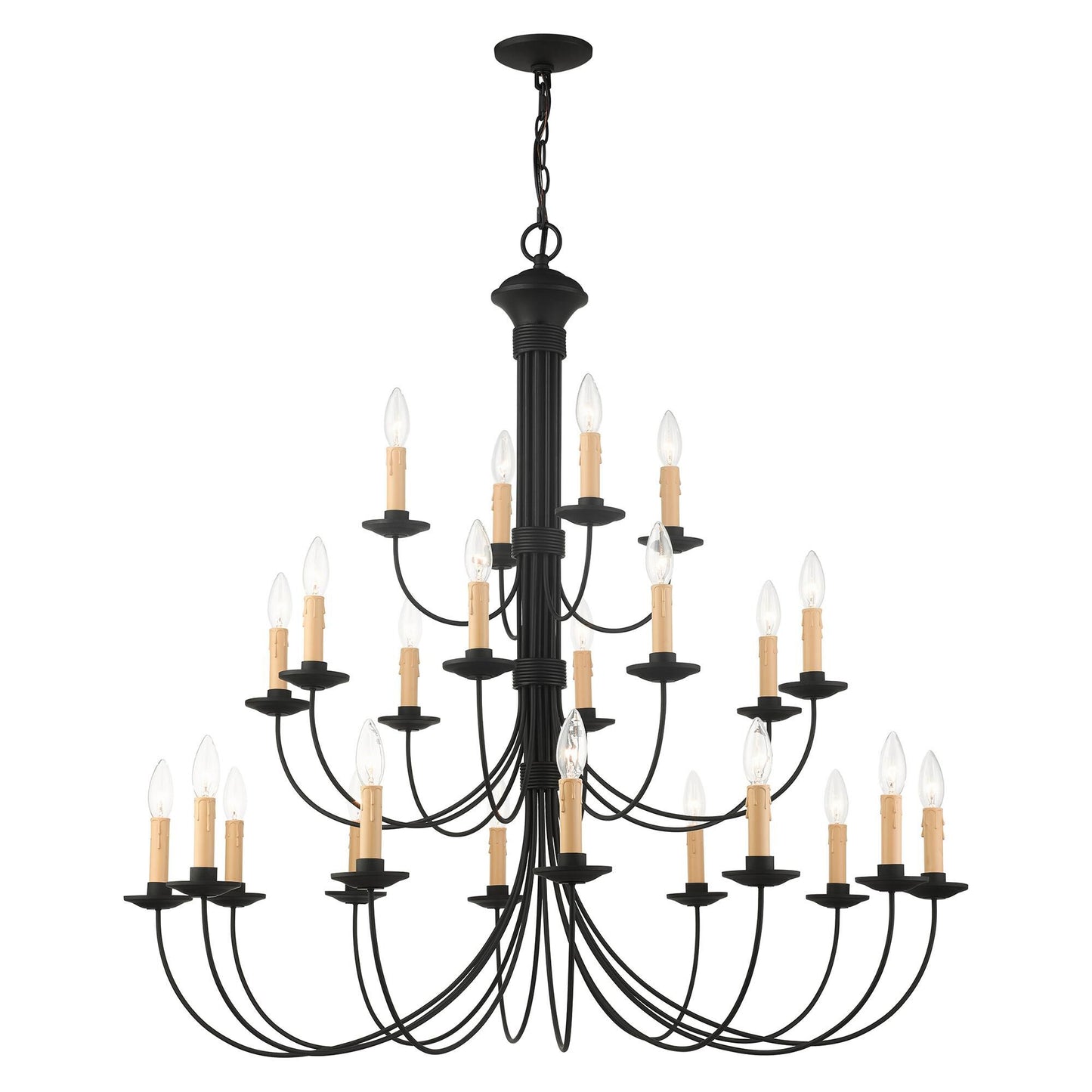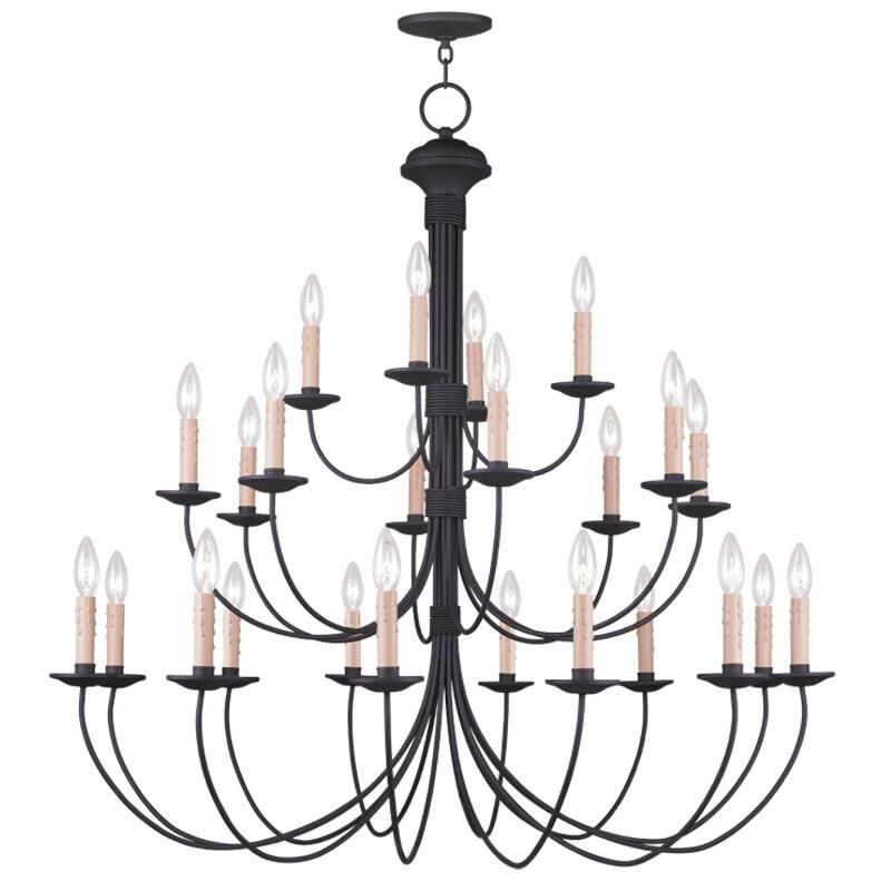 The clean design of this steel construction twenty light chandelier enhanced with a black finish. The sweeping arms create a slim silhouette from which the candelabra bulbs emit their soft, romantic glow. Its informal, transitional beauty works well with many room decor schemes.