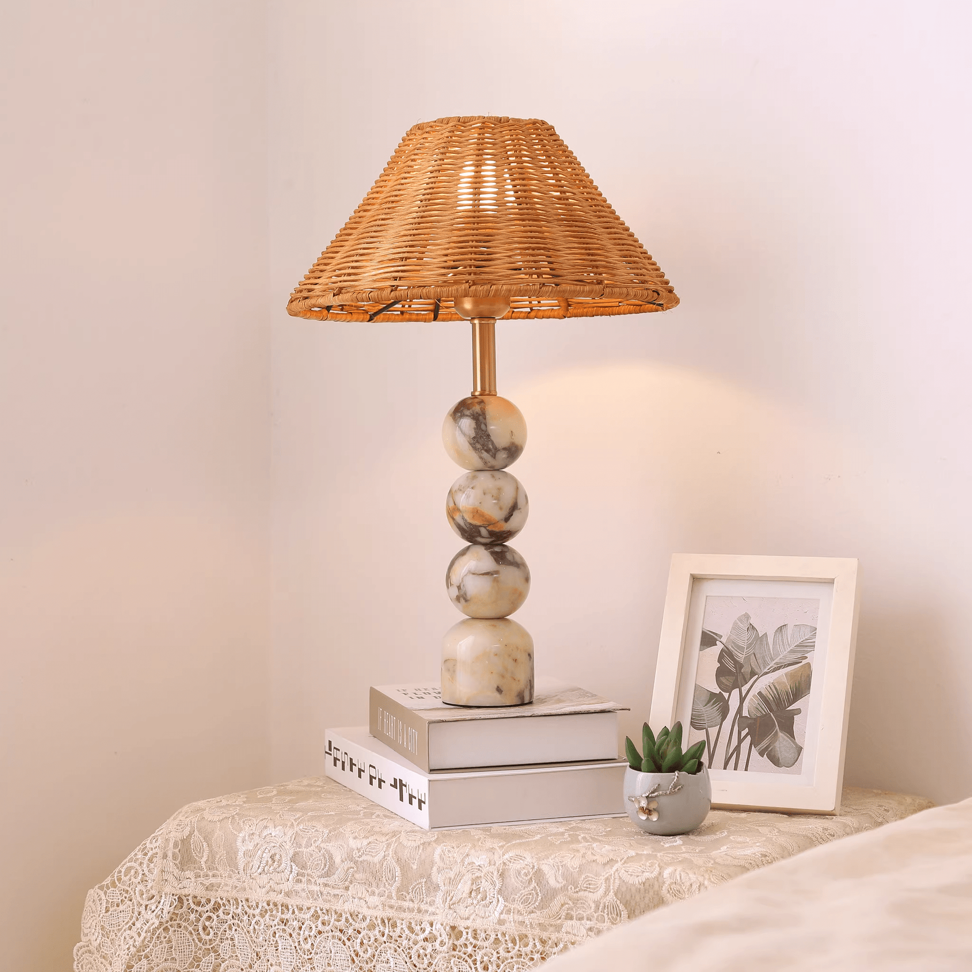 This table lamp features a base made of stacked marble orbs, showcasing the stone's natural, marbled patterns and rich textures. Topping the marble base is a woven rattan lampshade, which filters light to emit a warm, ambient glow. Blending the organic elegance of marble with the rustic charm of rattan, it adds a unique, eclectic touch to bedside tables, desks, or living spaces, merging natural materials with artistic design.