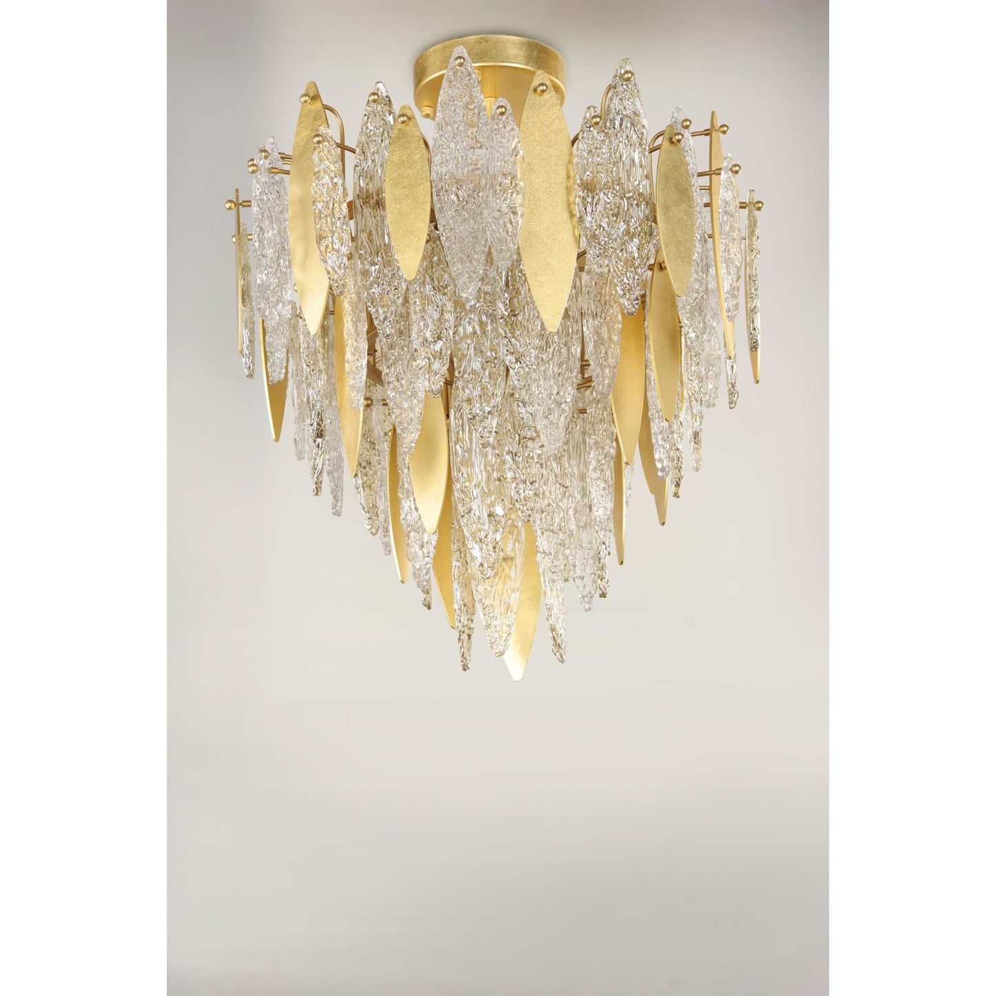 Hand-formed glass petals of Clear and Champagne-tint suspend from a tiered frame of gold and accented with petals of solid metal finished in Gold Leaf. Numerous candelabra sockets are strategically placed within the fixture to create glimmer and elegance to this majestic collection.