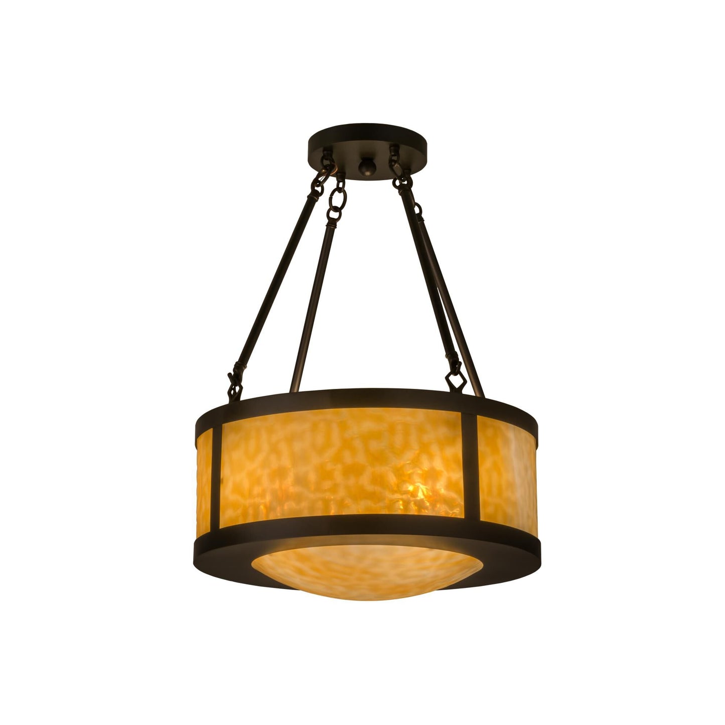 A handsome and distinctive lighting design to meet the ultimate in refined tastes; this ceiling fixture features classic contours with transitional styling. Beige art glass panels on the perimeter and the bottom of this fixture are enhanced with a frame and hardware hand finished in a warm Craftsman Brown. Handmade in Upstate New York; this fixture is available in custom sizes; styles; colors and dimmable energy efficient lamping options.