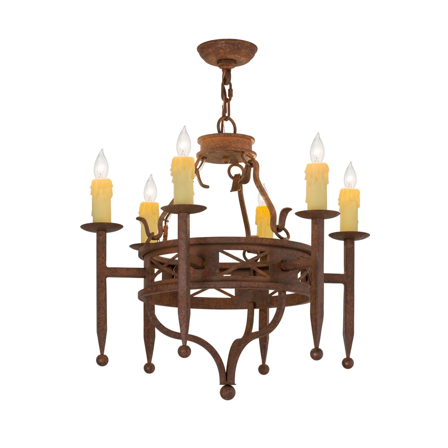 Offering a welcoming look and enchanting charm; Jasmine will add a rich element to your interiors. The chandelier is accentuated with six faux Ivory candlelights perched on bobeches with long ball point stems. The decorative accents and hardware are featured in a Rusty Nail Textured finish. Custom crafted in the Usa; this chandelier is available in custom sizes; styles and colors; as well as dimmable energy efficient lamping options. The fixture is UL and cUL listed for damp and dry locations.