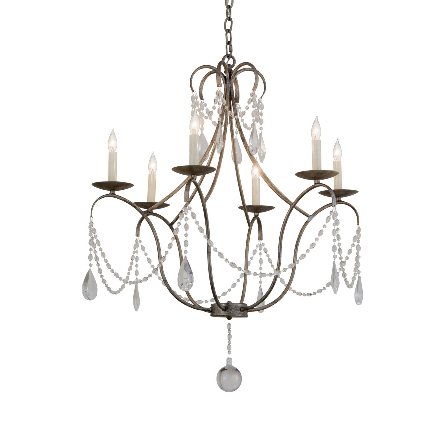Designed with a new twist on old world styling; Kaitlynn drapes delicate garlands of crystal beads adorned with coordinating pendalogues and a crystal finial. 6 Ivory faux candlelights are perched on gracefully fashioned bobeches embraced by swan-like arms of steel which are complemented with scroll-like accents from above; all featured in a hand-applied Corinth finish. Custom options includes special sizes; finishes; styles and dimmable energy efficient lamping such as Led. The chandelier is UL and cUL listed for dry and damp locations.
