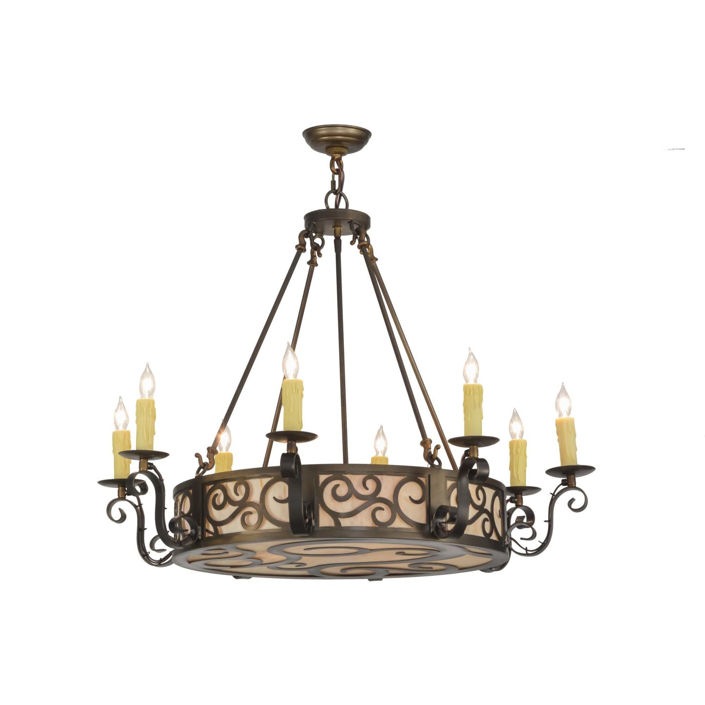 A touch of warm opulence is blended with elegant scroll-like styling. This chandelier offers a lovely transitional style; which is handcrafted with decorative accents and hardware featured in a stunning Antique Copper finish. The fixture integrates a Travertine Idalight diffuser; which is enhanced with sparkling illumination emanating from eight faux candlelights perched on bobeches embraced by scroll styled arms. Custom crafted in the Usa; this fixture is available in custom sizes; styles; colors and dimmable energy efficient lamping. Delano is UL and cUL listed for damp and dry locations.
