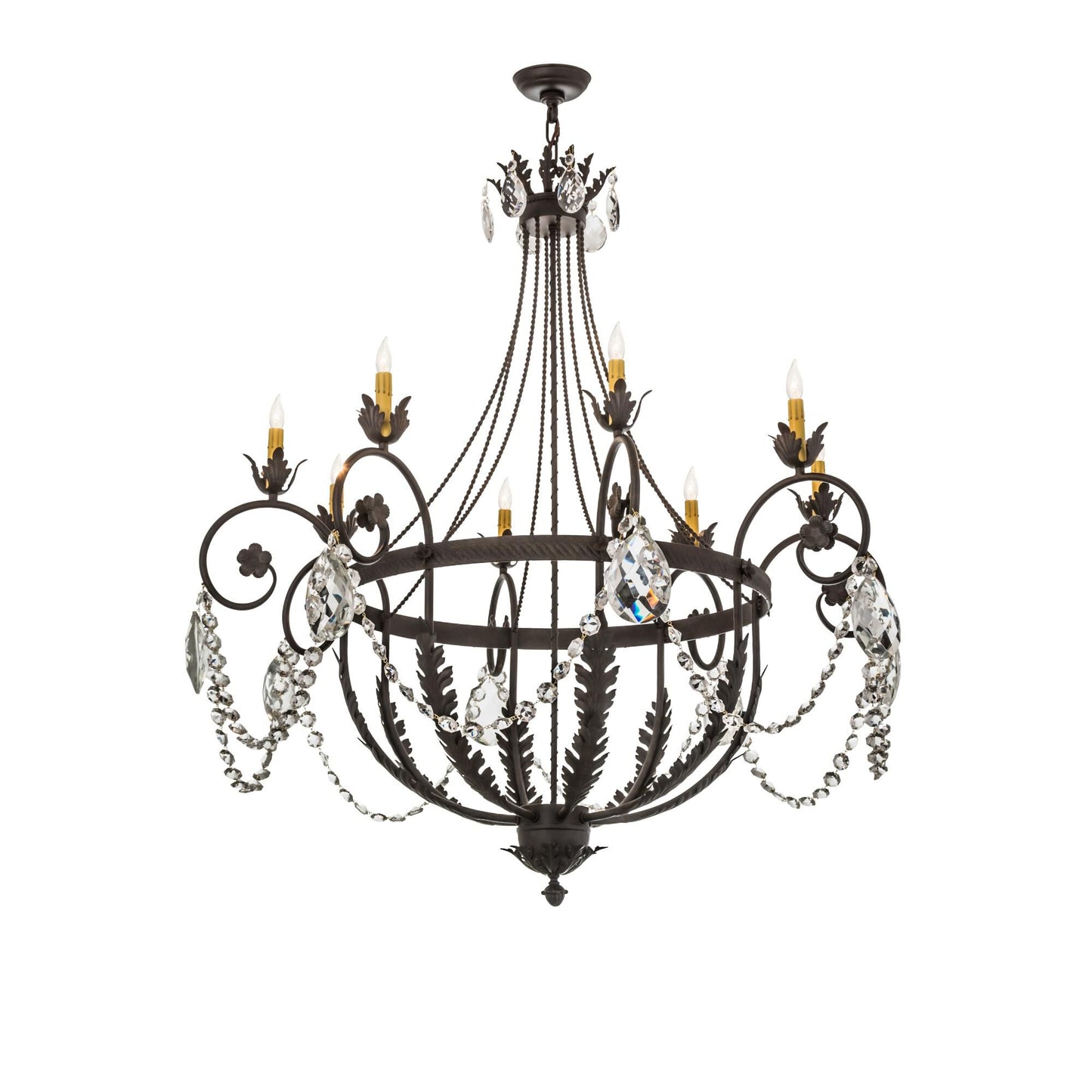 Exquisite styling and luxurious charm are reflected in these faceted crystal charms; scroll arms; Acanthus leaves and the rich Chestnut finished hardware featured; like a fine wooden paneled library. This elegant chandelier embraces eight Amber faux candlelights. This chandelier features quality materials and hand detailed American craftsmanship perfected by years of time honored artistry; passed down from generations of prolific artisans. Custom sizes; styles; colors and dimmable energy efficient lamping options are available. The fixture is UL and cUL listed for damp and dry locations.