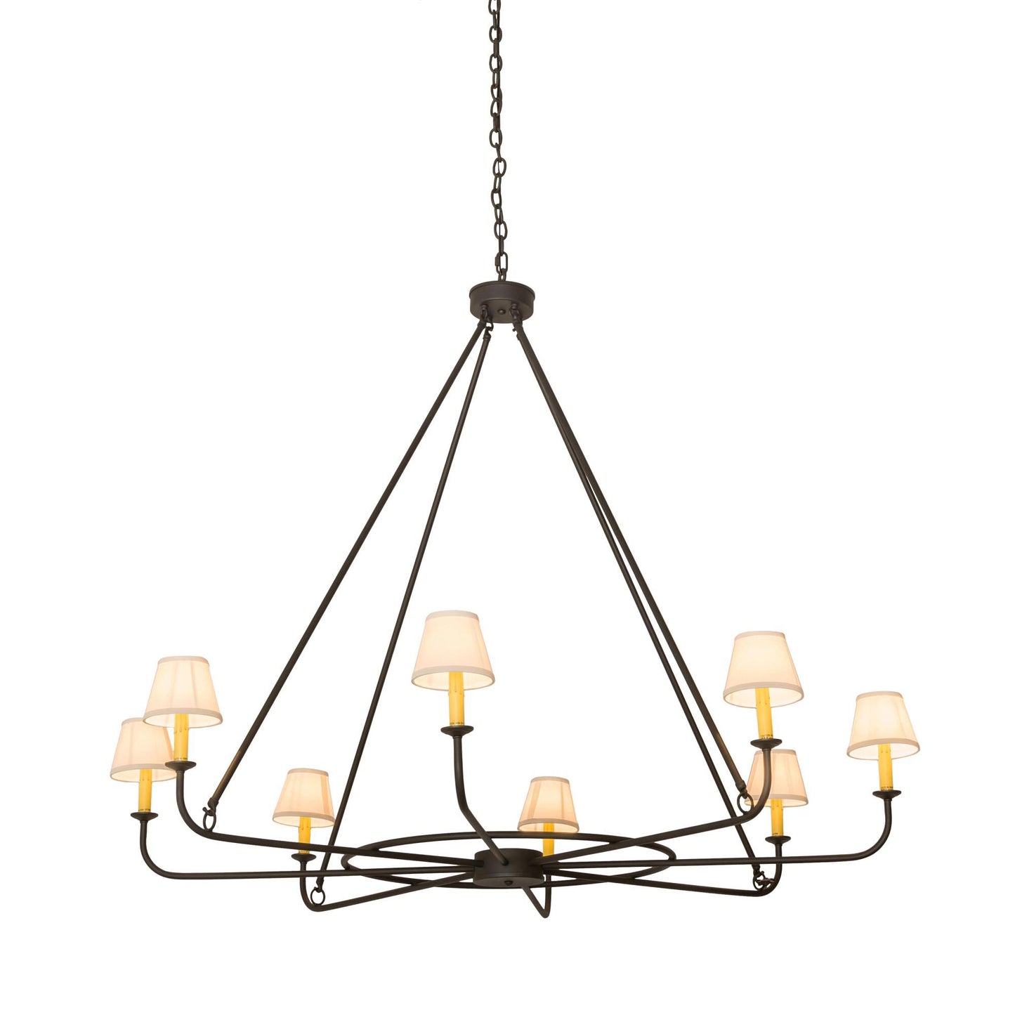 An exquisite articulation of beautiful ambient lighting and graceful design; the Brach Ring chandelier features a stunning centerpiece with 8 curved arms branching out with Ivory faux candlelights crowned with Ivory Textrene shades perched atop of custom tailored bobeches. The chandelier is highlighted with stunning Hand-forged Iron hardware is hand finished in a Wrought Iron hue. Ideal for lobbies; foyers and other spaces in homes; restaurants; hotels and other fine interiors; the fixture is custom crafted by highly skilled artisans in our manufacturing facility in Yorkville; New York. Custom sizes; designs; colors and dimmable energy efficient lamping options are available. The 60-inch wide chandelier is UL and cUL listed for damp and dry locations we do not recommend installing it in spaces that experience a large amount of moisture.