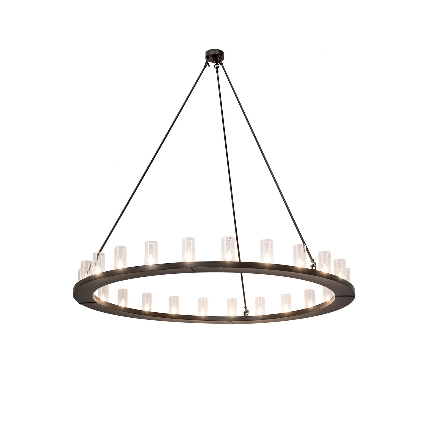 Crafted by the skillful hands of Meyda artisans; the striking Loxley chandelier is topped with 24 Clear Seeded glass candle columns. This transitional fixture is made in the USA with hardware finished in a Timeless Bronze. Perfect for residential; hospitality; retail or commercial applications. Custom sizes; styles and colors available. Energy efficient options.