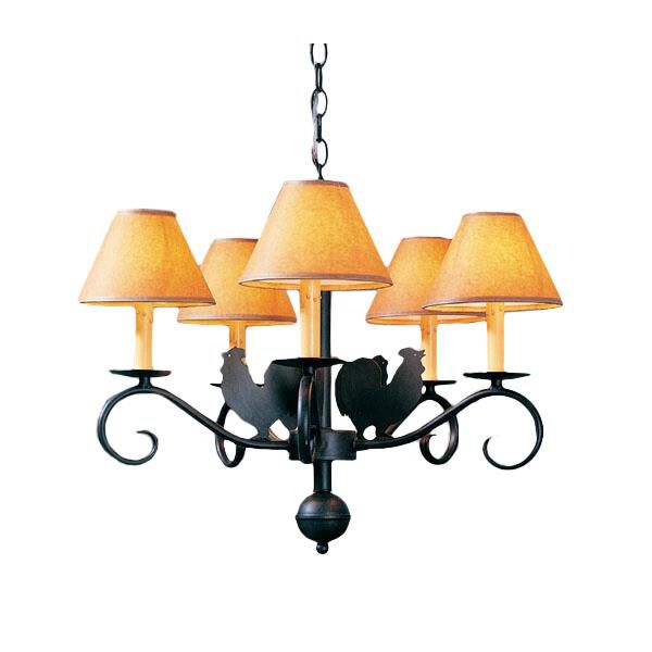 Two Rooster silhouette designs highlight the Animal Chandelier. 4 Amber Parchment shades crown Amber faux candlelights perched on bobeches which are embraced by scrolled arms. The frame; hardware and decorative accents; including bottom orb finial; are featured in a Rustic Iron finish. Handcrafted by highly skilled artisans in the Yorkville; NY manufacturing facilities; this 24-inch wide ceiling fixture is available in custom sizes; styles; colors and dimmable energy efficient lamping options such as LED. This charming fixture is UL and cUL listed for dry and damp locations.