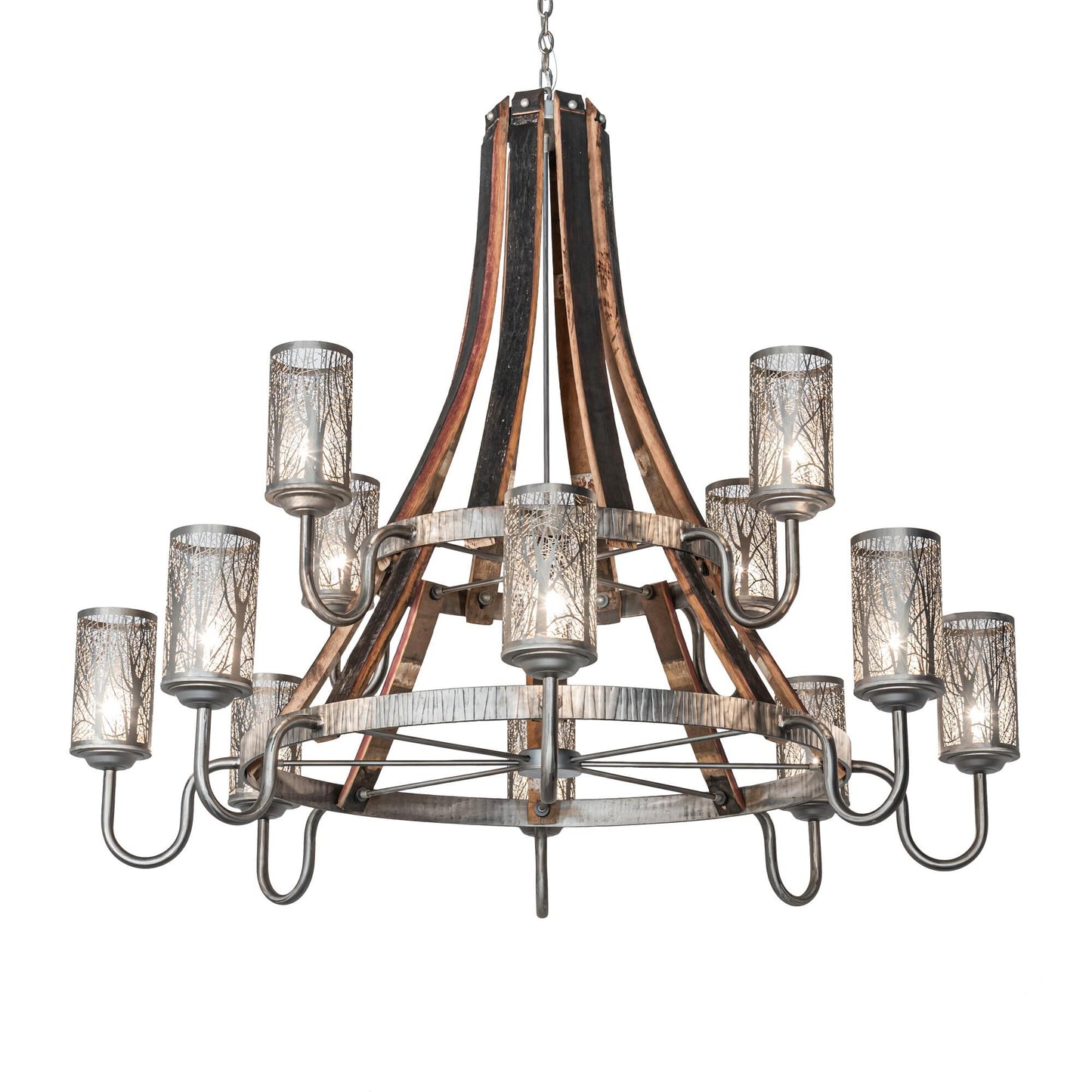 Elegant charm blends with rustic beauty. This chandelier is inspired by antique staves traditionally bound by metal hoops in the construction of beer and whisky barrels and wine casks. A Hammered Industrial Steel band and curved arms embrace 12 shades featuring Winter Maple Trees with stark branch designs. The shades align around the Charred Wooden Barrel Stave frame like soldiers at attention in abeyance of the barrel to which they serve. Overall height ranges from 58 to 178 inches as chain can be easily adjusted in the field. The Barrel Stave Winter Maple Chandelier is featured in our American made; American designed handcrafted Contemporary Rustic Collection. Manufactured in Yorkville; NY. UL and cUL listed for dry & damp locations.