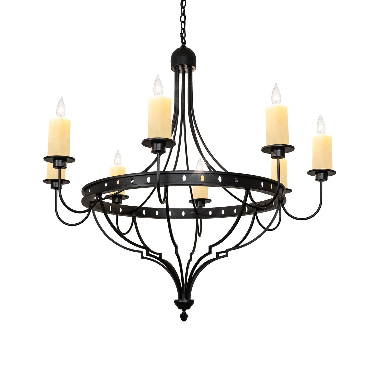 An elegant statement piece of distinction. The Botticini Chandelier features 8 Ivory faux candlelights aligned around the pierced metal ring which is hand finished in Textured Black. The overall height ranges from 53 to 292 inches as the chain length can be easily adjusted in the field to accommodate your specific lighting application needs. Handcrafted by highly skilled artisans in our 180;000 square manufacturing facility in Yorkville; New York. Candlelight colors; metal finishes and fixtures sizes can be customized to meet your needs. UL and cUL listed for damp and dry locations.