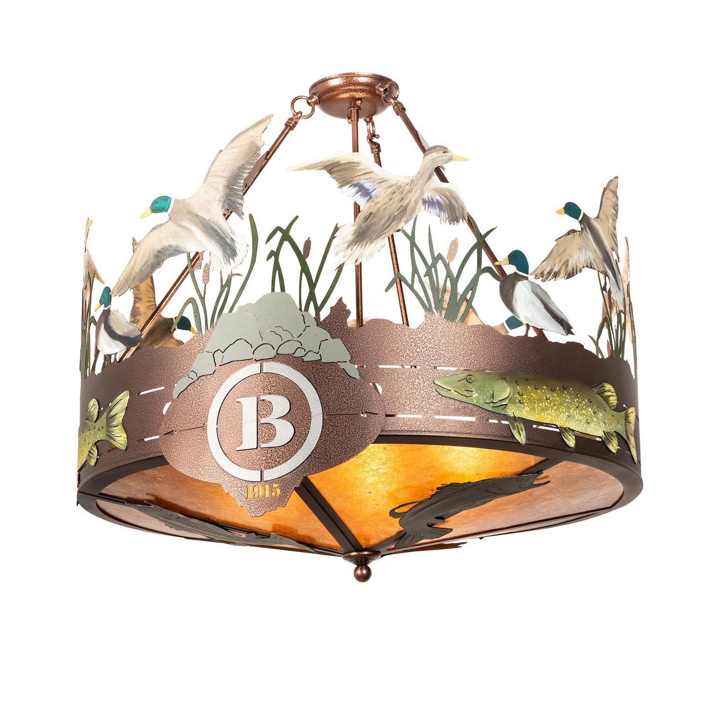 Ducks splash and fly above the marsh in this wildlife inspired fixture. Custom handpainted Ducks; Pike and Reeds are designed above the Amber Mica diffuser which is accented with handpainted Bass silhouettes. The fixture is personalized with the laser-cut The Boulders Cooperstown; NY name and Black handpainted logo. Hardware is featured in a New Copper Vein finish. UL and cUL listed. This personalized item is shown as an example of our craftsmanship and custom capabilities. This item is not for sale as is" but can be customized to fit your business or family needs. "
