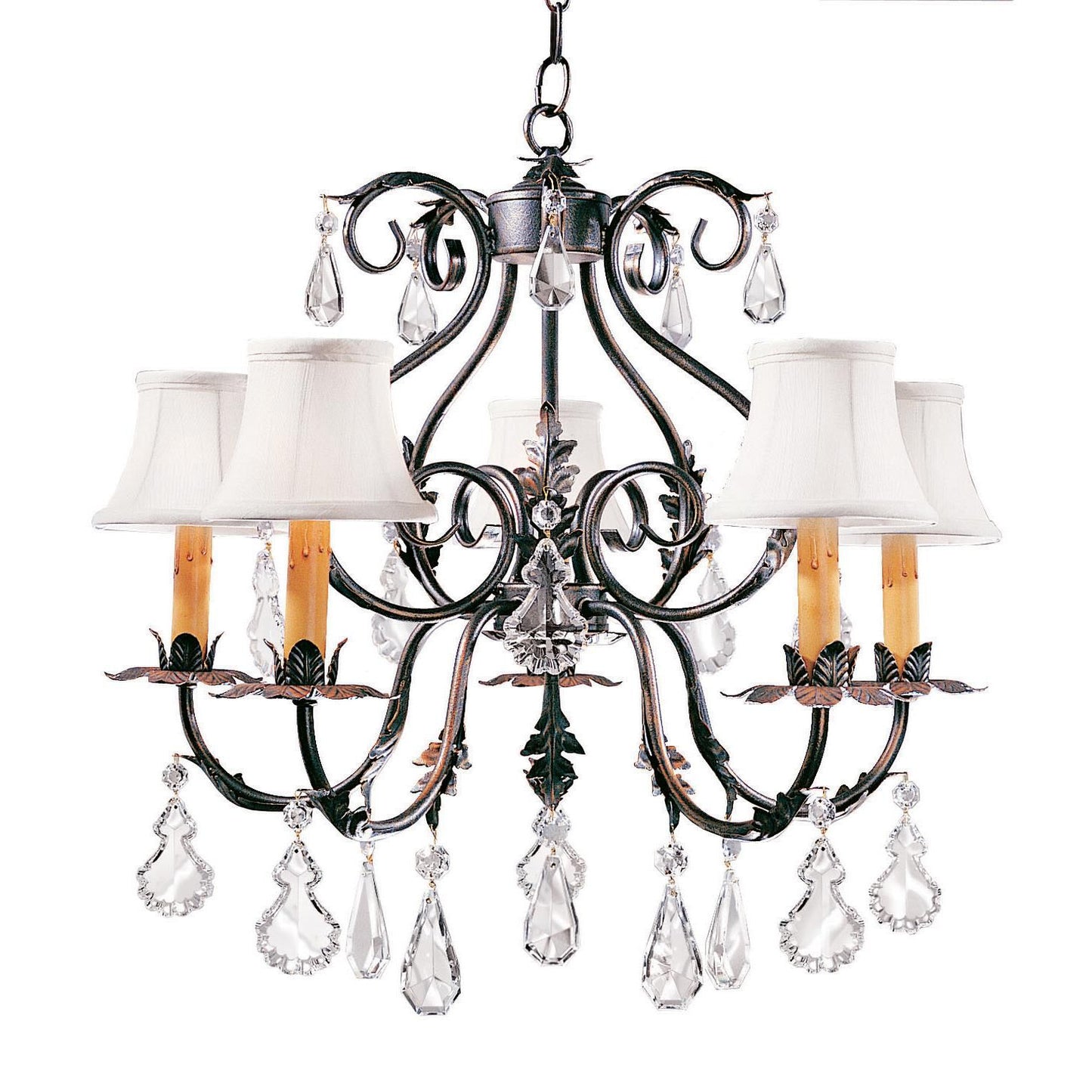 A splendid elegance is combined with refined sophistication. The Chantilly Chandelier impresses with Hand-forged Iron frame and floral bobeches that embrace Amber faux candlelights which are crowned with Cream Trumpet Textrene Shades for an upscale look. French Bronze finished hardware with acanthus leaves and scrolled accents are trimmed with luxurious crystal pendalogues. Handmade in the USA; this chandelier is available in custom styles; colors; and sizes; as well as dimmable lamping options. The 24-inch wide fixture is UL and cUL listed for dry and damp locations however we do not recommend installing it in spaces that experience a large amount of moisture due to the fabric shades.