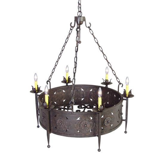 Bolster a dining room; foyer or any other room in your castle with the stunning Claudio Chandelier. This Gothic Revival styled fixture features quatrefoil designs with floral medallions which are complemented with floral ballpoint bobeches embracing six Amber faux candlelights. The frame; decorative accents and hardware are featured in a Cajun Spice finish. Custom sizes; styles and finishes are available; as well as dimmable energy efficient lamping options such as LED. The 38-inch wide fixture is UL and cUL listed for dry and damp locations.