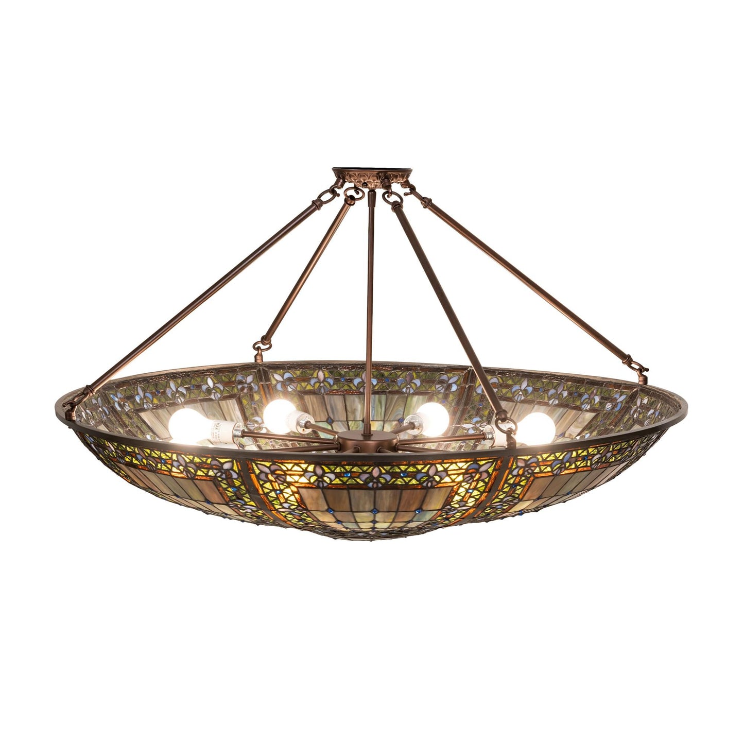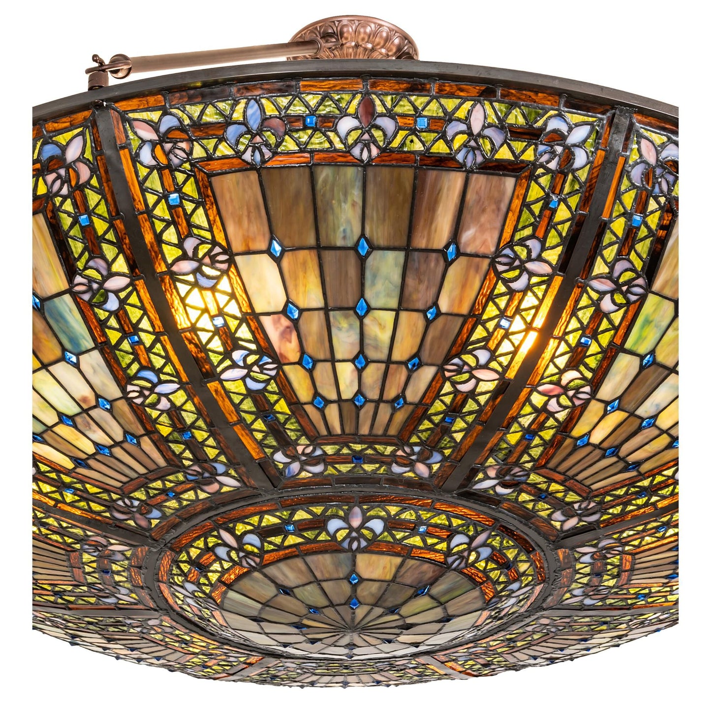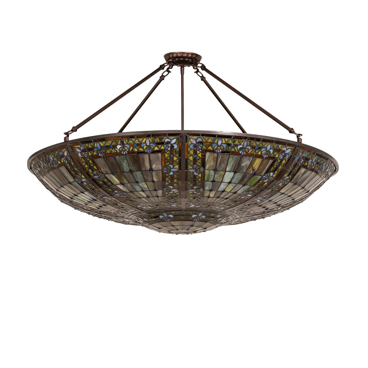 A Meyda Original. Reminiscent Of Castle And Cathedral Glass; The Fleur-De-Lis Inverted Ceiling Fixture Features An Intricate Design With Purple Stylized Tri-Petaled Irises And Azure Colored Jewels Against Bands Of Green And Umber Surrounding A Mottled Blue; Mauve; And Peridot Field. The Shade Is Created With The Famous Meyda Tiffany Copperfoil Construction Technique; A Matching Lighted Stained Glass Hub And Complemented With A Mahogany Bronze Finish. Ul And Cul Listed For Dry And Damp Locations. Each Shade Is A Unique Work Of Art With Color Variations Based On Natural Ingredients Inherent In The Glass. Contact Us If Color Matching Is Critical When Ordering Multiple Items.