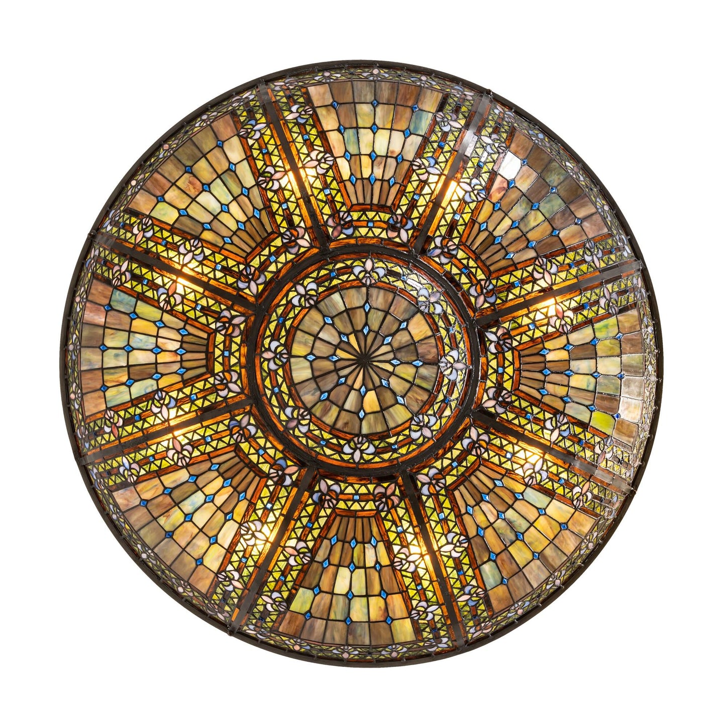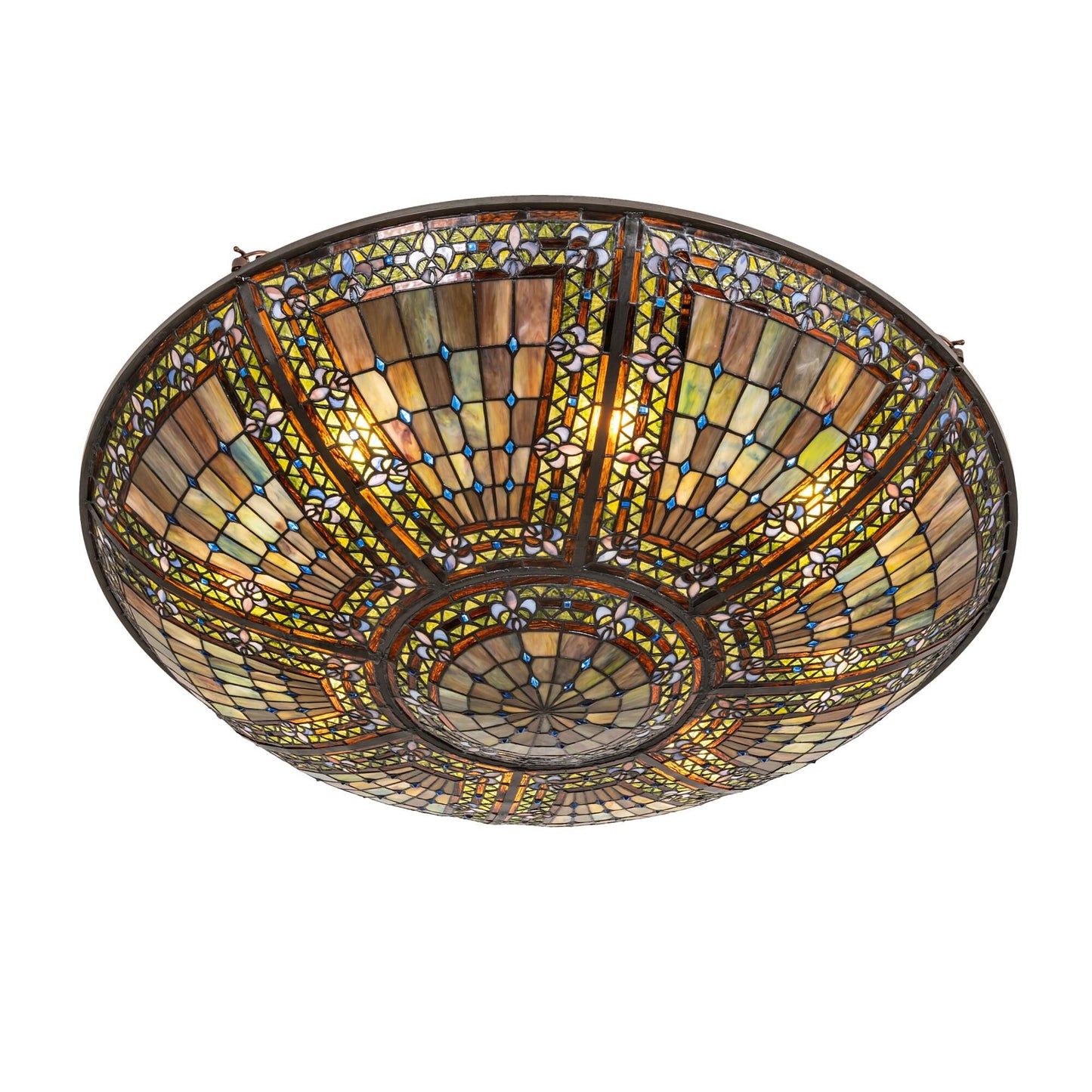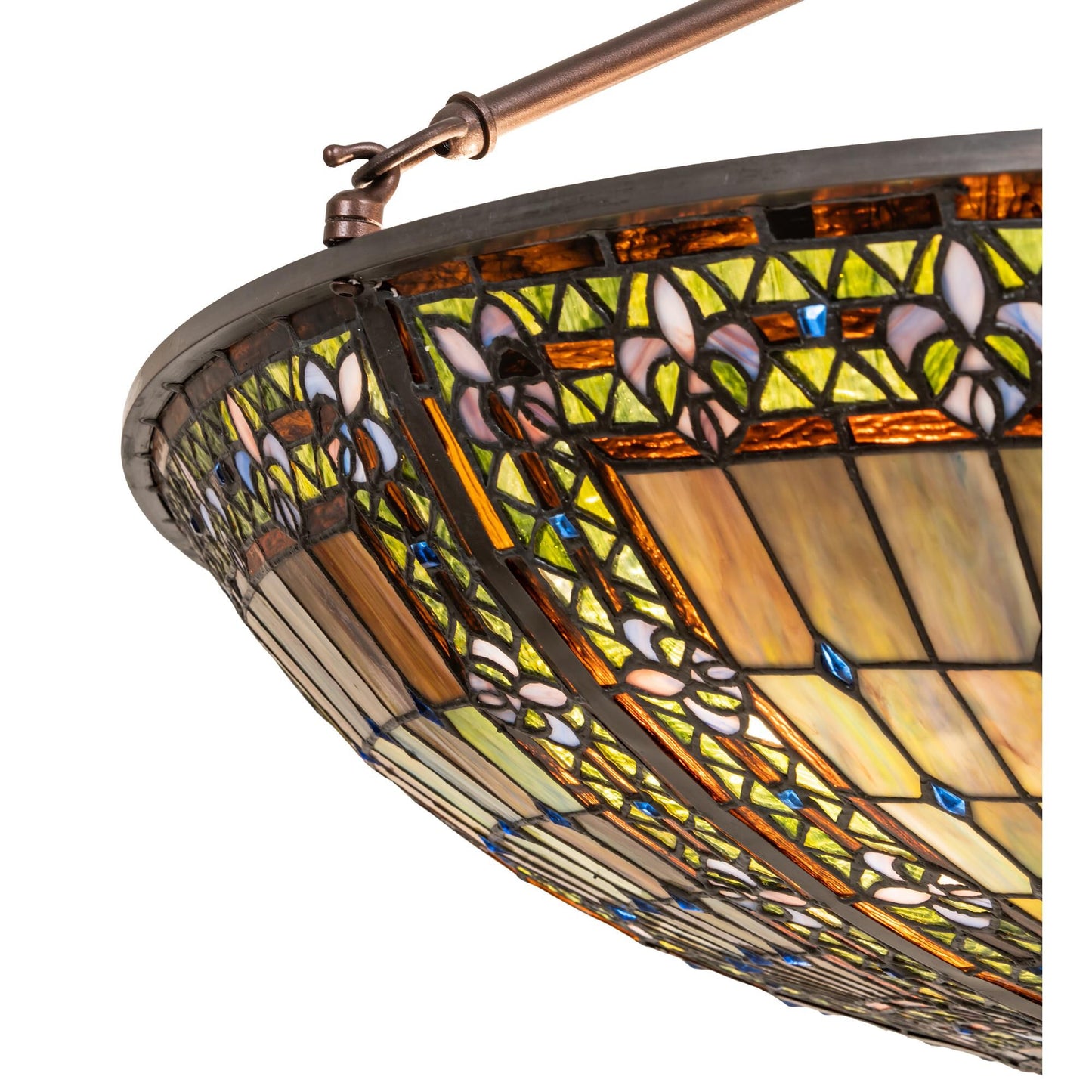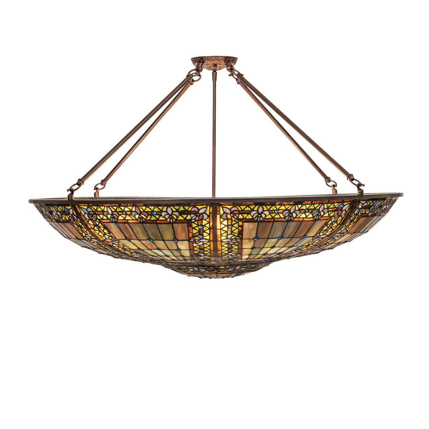 A Meyda Original. Reminiscent Of Castle And Cathedral Glass; The Fleur-De-Lis Inverted Ceiling Fixture Features An Intricate Design With Purple Stylized Tri-Petaled Irises And Azure Colored Jewels Against Bands Of Green And Umber Surrounding A Mottled Blue; Mauve; And Peridot Field. The Shade Is Created With The Famous Meyda Tiffany Copperfoil Construction Technique; A Matching Lighted Stained Glass Hub And Complemented With A Mahogany Bronze Finish. Ul And Cul Listed For Dry And Damp Locations. Each Shade Is A Unique Work Of Art With Color Variations Based On Natural Ingredients Inherent In The Glass. Contact Us If Color Matching Is Critical When Ordering Multiple Items.