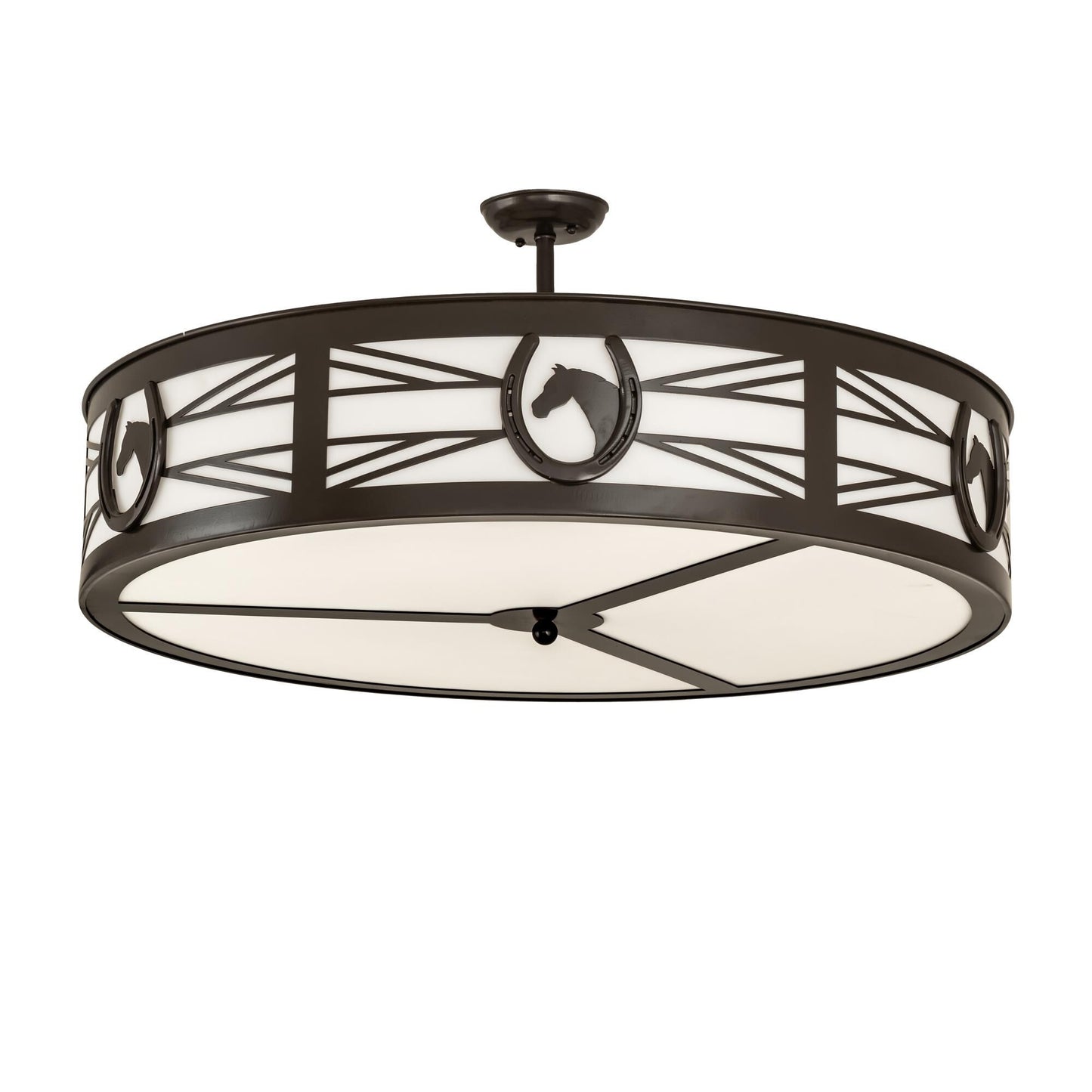 A horse portrait framed with a lucky horseshoe encircles this handsome ceiling fixture. Beautiful ambient light projects through stunning Statuario Idalight accented by a geometric design styled after fencing commonly found at horse stables. Decorative hardware; frame and accents are featured in a Timeless Bronze finish. Perfect for game rooms; man caves; equestrian centers and other residential and commercial spaces. Handcrafted by Meyda artisans in the USA. Custom sizes; styles and colors are available. Energy efficient lamping options such as LED are offered. This 36-inch wide fixture is UL and cUL listed for damp and dry locations.