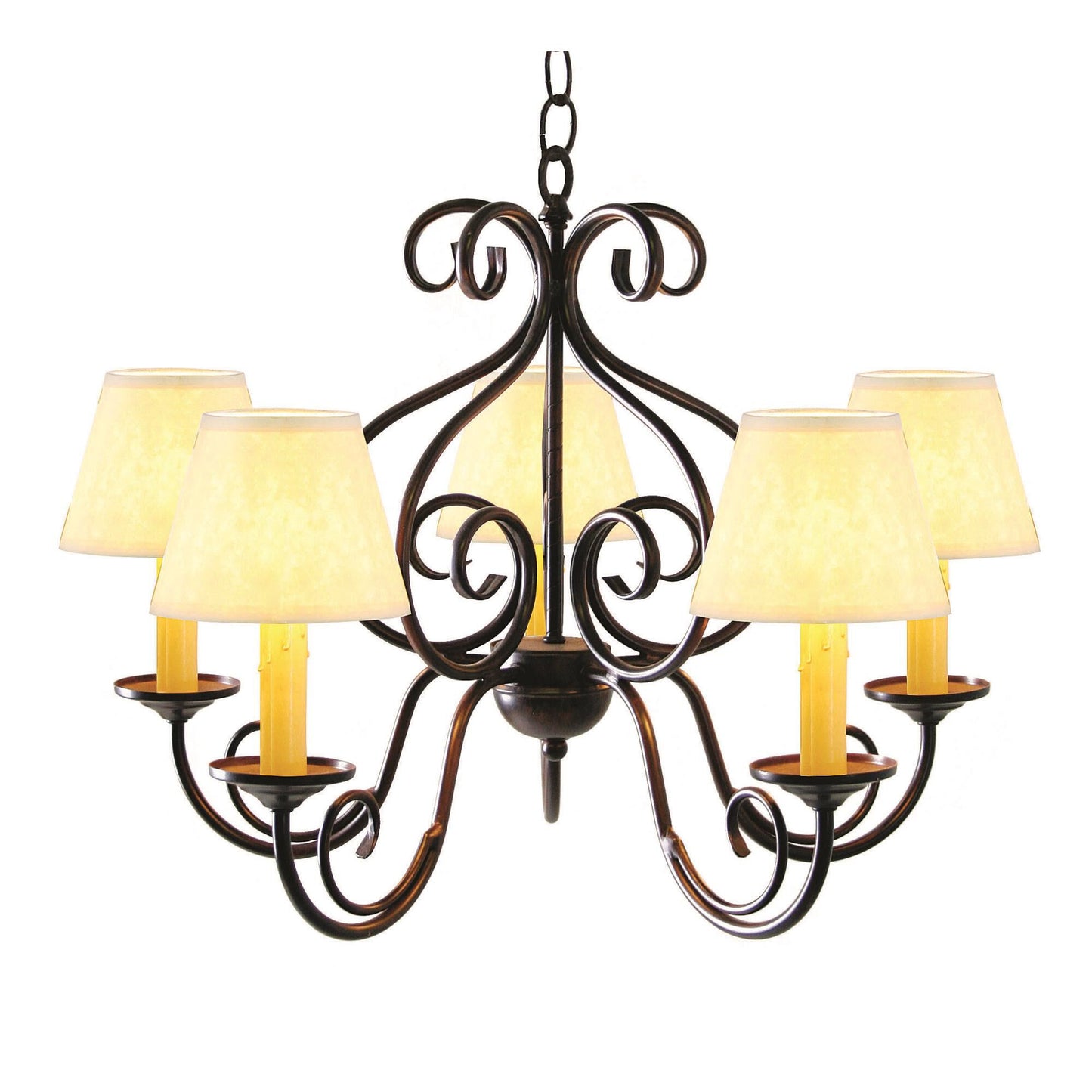 The perfect centerpiece for any room; Jenna offers a sumptuous decorative design featured in a Cajun Spice finish. Elaborate arms; scrolled accents; and five bobeches embrace faux candlelights topped with Celadon Textrene shades that add a touch of elegance and warm ambient lighting to your interiors. The frame and luxurious design evoke a rich; lustrous charm. Crafted by hand in our Yorkville; NY manufacturing facility; this fixture is available in custom sizes; styles and colors; and with dimmable; energy efficient lamping options such as LED. The chandelier is UL and cUL listed for damp and dry locations.