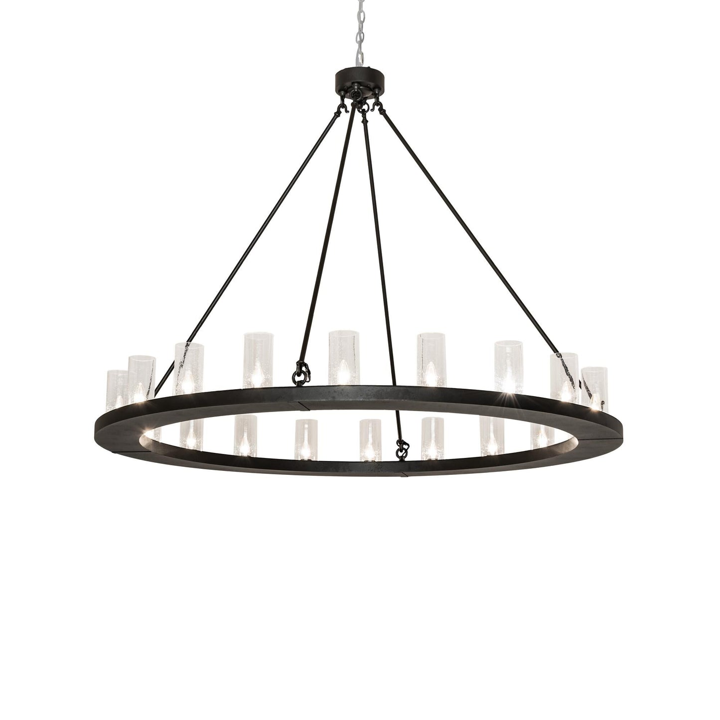 Replicating a classic chandelier design. Loxley features 20 Seeded Glass Cylindres on a decorative ring suspended by chains and hand finished in Old Wrought Iron. Ideal for illuminating dining areas; conference tables; lobbies and other residential; hospitality and commercial spaces. Overall height ranges from 56 to 126 inches as the chain can be easily adjusted in the field. Domestically Produced in our 180;000 square foot manufacturing facility in Yorkville; New York. Customize the lens colors; metal finishes and sizes to meet your desires. UL and cUL listed for dry and damp locations.