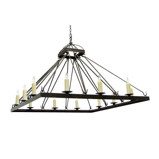 The Retreat Chandelier reflects a dramatic pyramid style outlined with 12 Ivory faux candlelights for a beautiful decorative array of ambient illumination. The rugged geometric frame is embraced by hooked struts to a smaller square shaped hub. The frame and hardware are offered in a warm Gilded Tobacco finish. The overall height ranges from 47 to 82 inches as the chain can be adjusted easily in the field. Faux candlelight colors; metal finishes and chandelier sizes can be customized. UL and cUL listed for dry and damp locations.