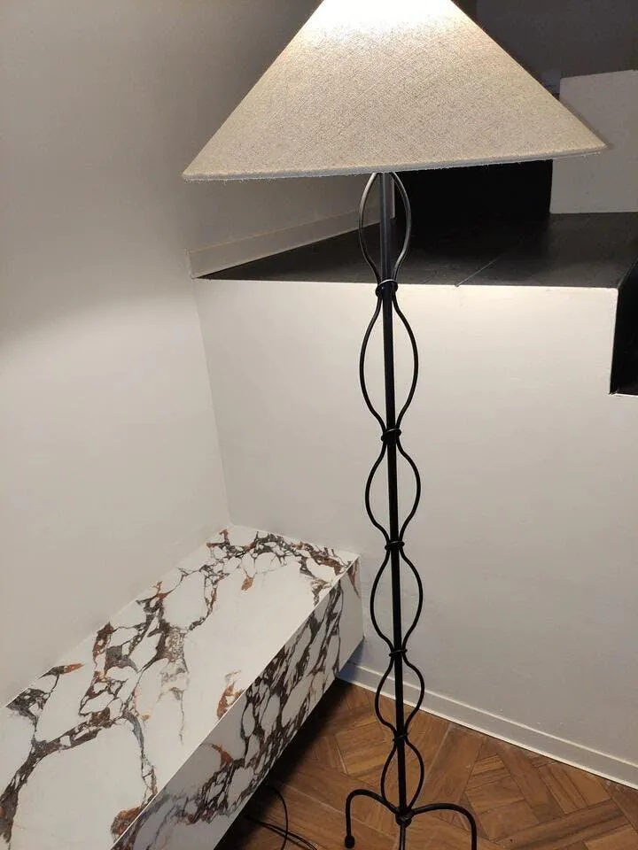 A sleek and artistic floor lamp featuring a black wrought-iron base with an intricate twisted design. The tapered fabric lampshade diffuses light softly, making it a refined addition to modern or industrial interiors.