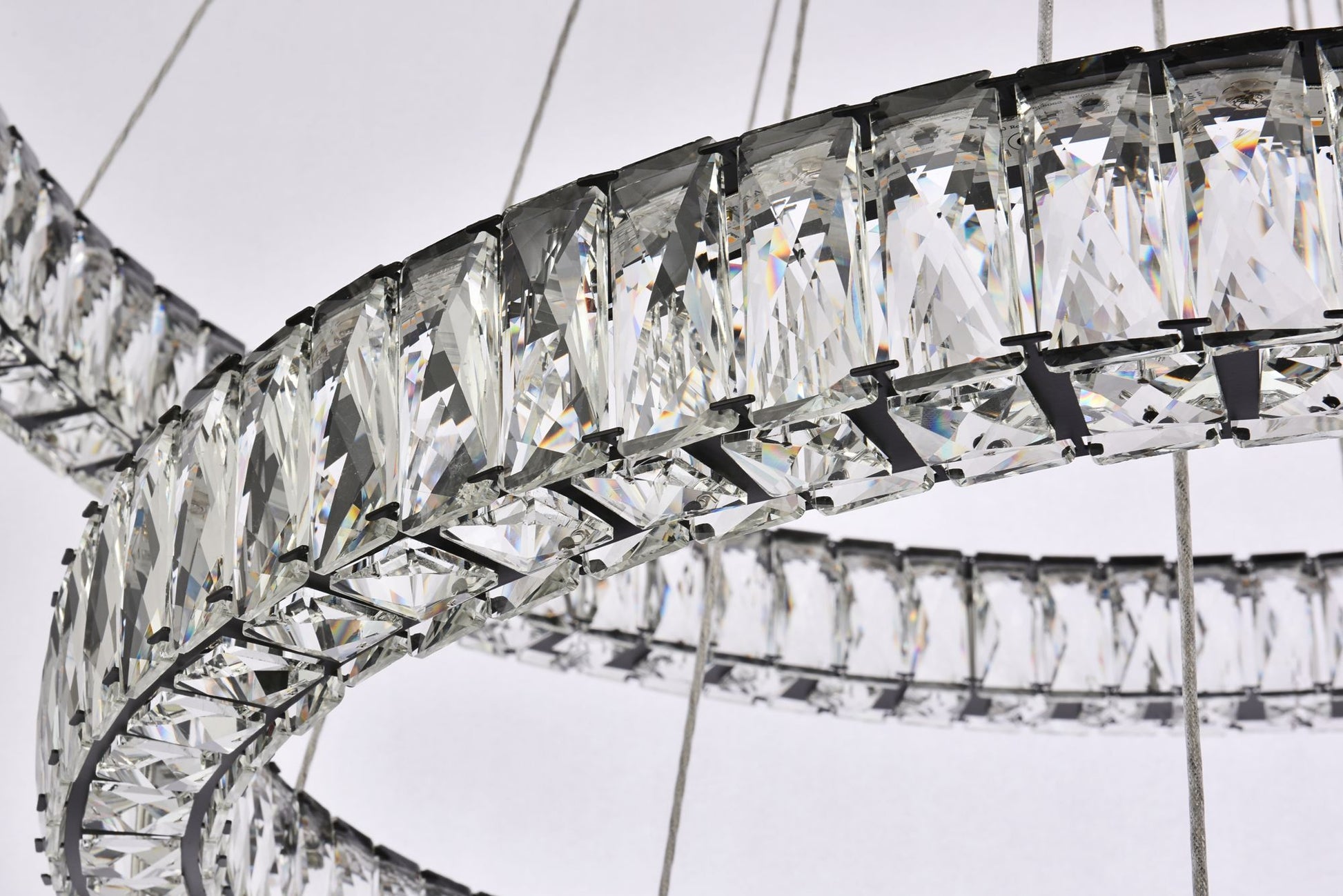 A dazzling modern glam energy-efficient LED chandelier that glitters with a black finish over the iron and stainless frame adorned by numerous clear crystal elements.