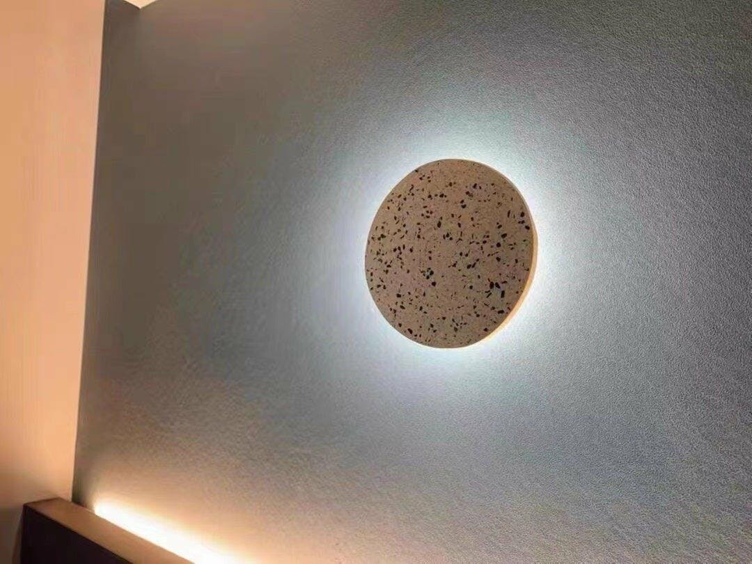 A floating terrazzo disc, offset and backlit through a thoroughly resolved prism, creates an impression reminiscent of celestial orbs in eclipse. Available in two diameters and depths, and four colors, the Terrazzo Wall Light is perfectly suited as a sculptural cluster, or equally stunning on its own.