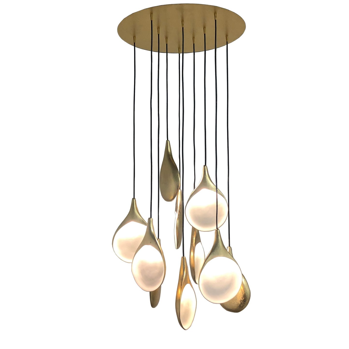 Simple and chic, reminiscent of natural forms, the Stillabunt 10 Port Chandelier is made by the most skilled Italian craftsmen entirely in ceramic. Soft light fills the off-white front; the sides and back are beautifully covered with gold leaf. Hanging in a group of 10 on a gold leaf celing mount for a mesmerizing effect.