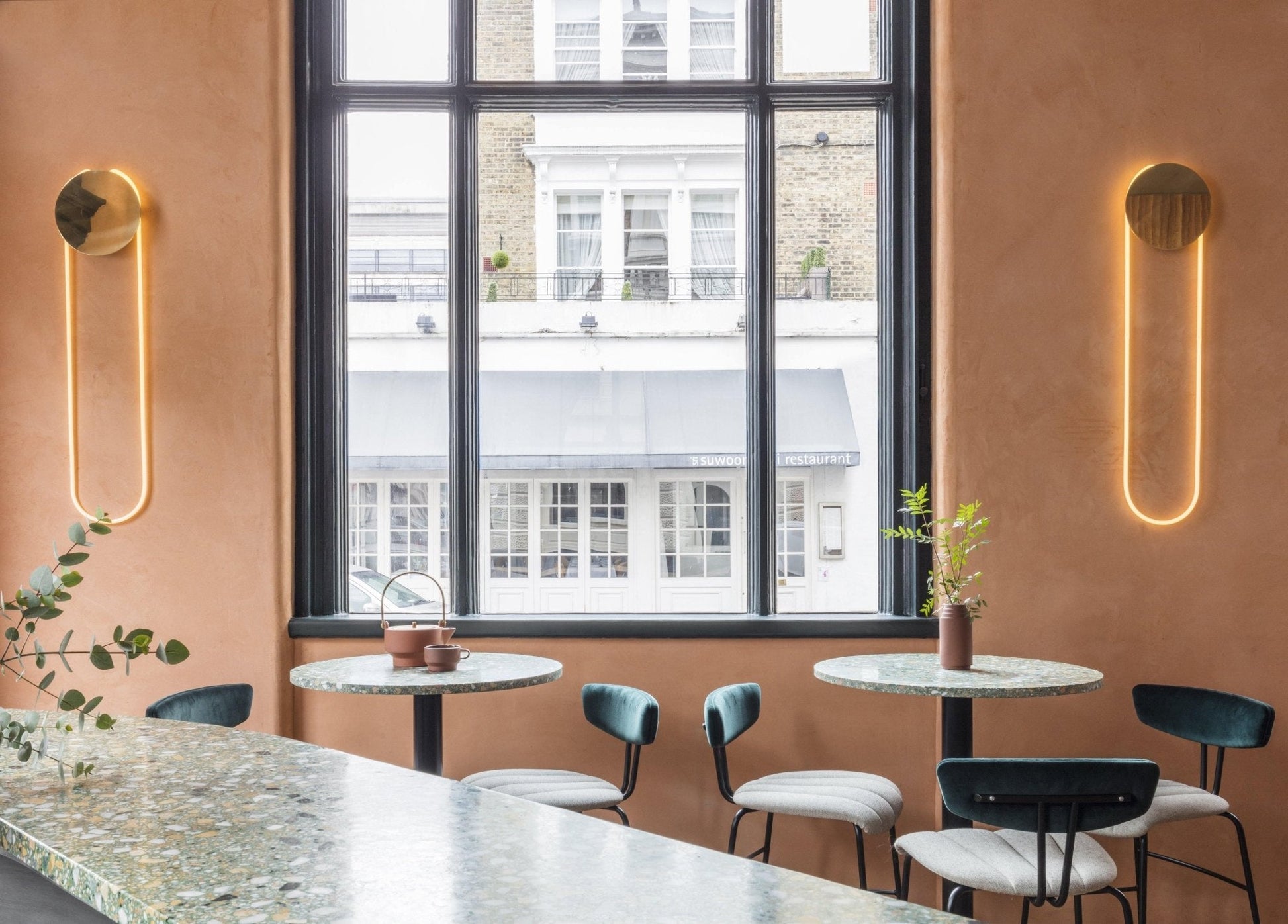 RA Wall participates in its surroundings by playing with contrasts, shadows and reflections. The circular neon tube emits a bright light that reflects softly on the wall. A solid bronze disc eclipses a part of the light and draws in the hues of the setting.