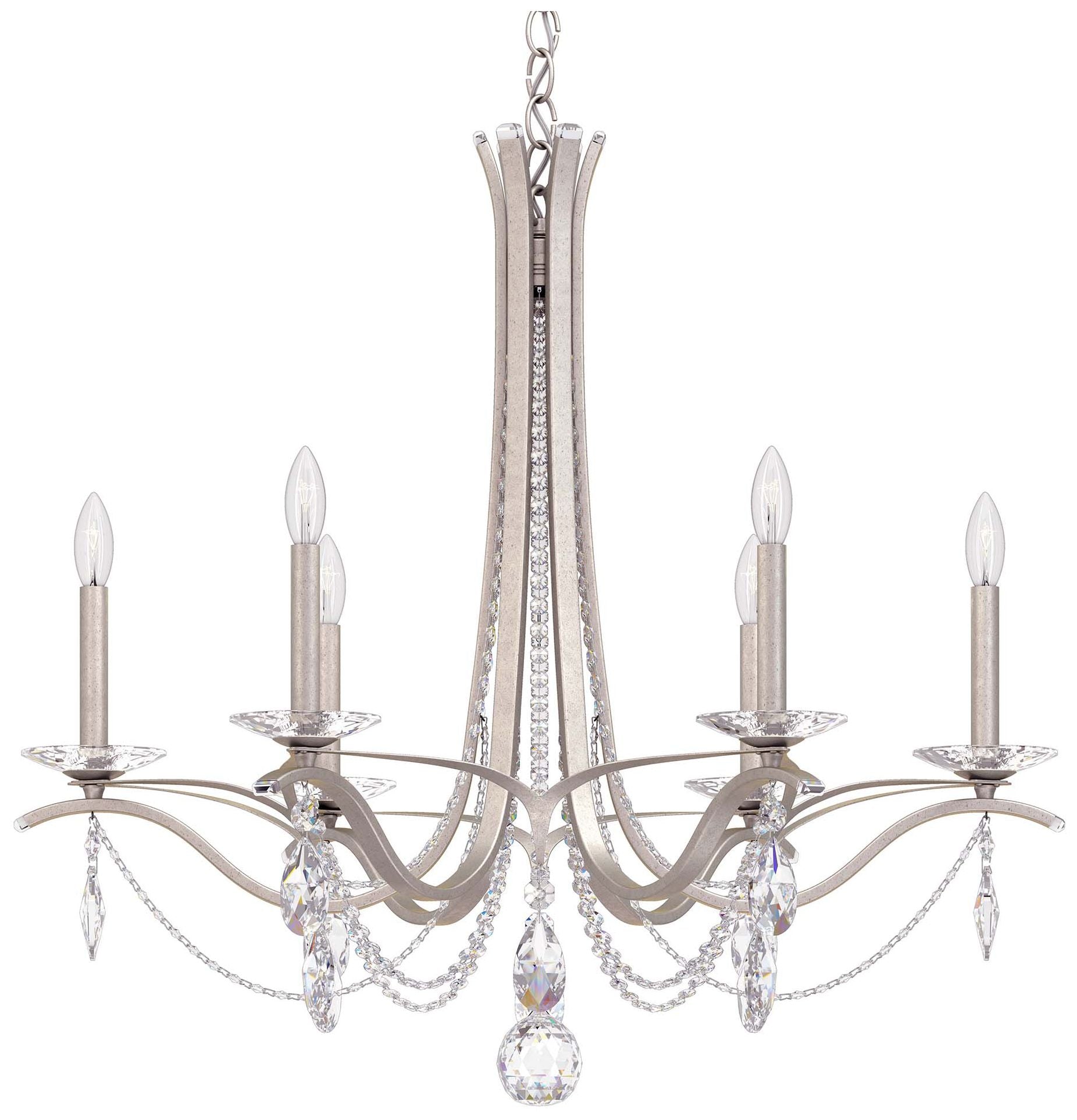 Elegance takes center stage in this Vesca six-light chandelier, shimmering in antique silver and adorned with heritage hand-cut crystal accents.