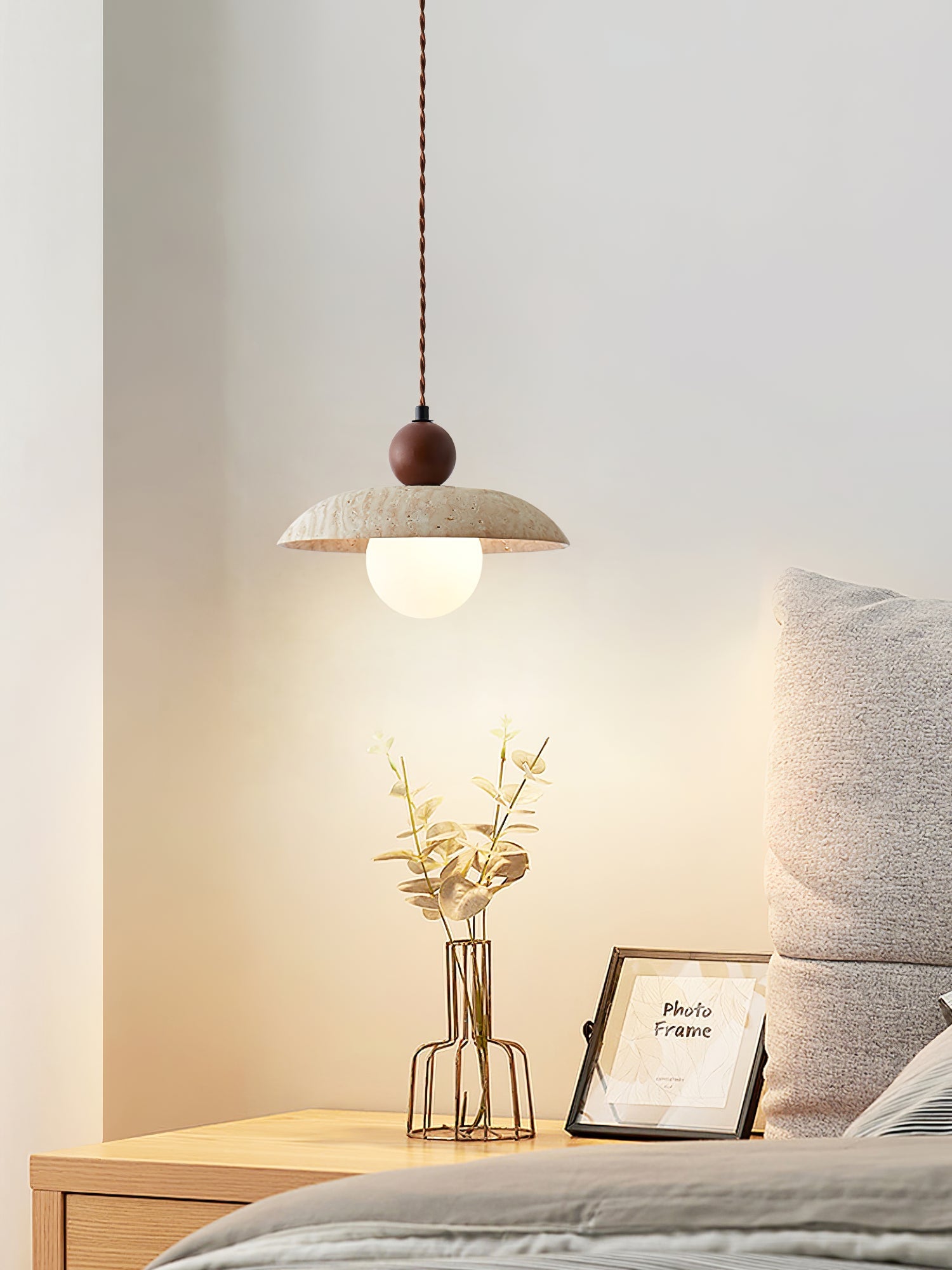 The Soluna Pendant Light brings together hand-polished travertine, a matte clay sphere, and a warm glowing bulb in a balanced composition of raw texture and natural harmony. Perfect for dining spaces, bedside ambiance, or cozy corners seeking a sculptural focal point.