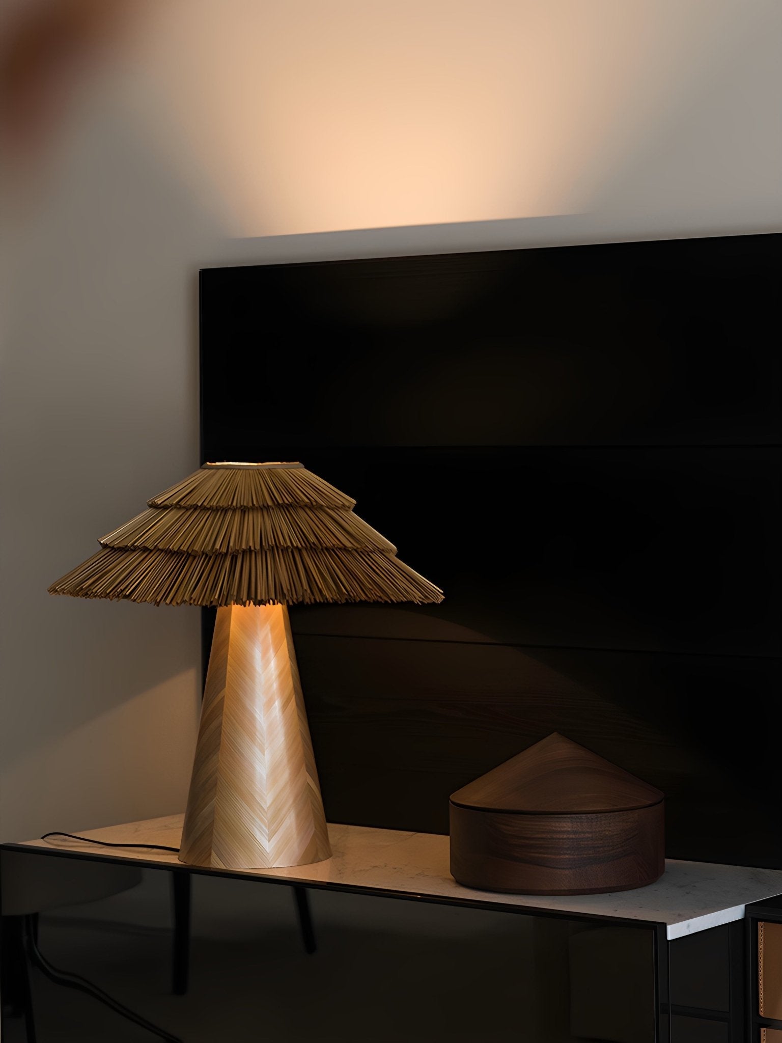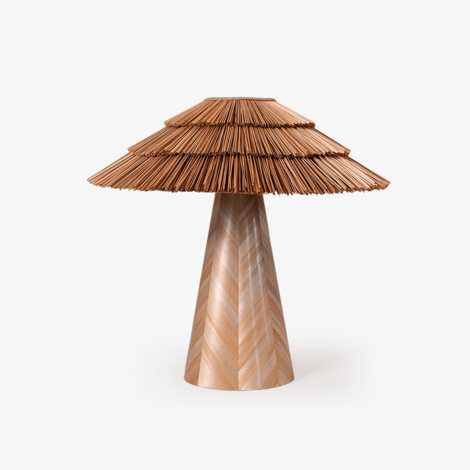 Bring organic charm and warmth to your space with the Thatch Table Lamp. This beautifully handcrafted piece features a tiered, umbrella-like shade made from meticulously arranged Natural Straw, diffusing a soft, inviting light. The conical base is crafted from elegant Light Wood Veneer with a subtle vertical pattern. Ideal for Bohemian, Coastal, or Japandi inspired interiors.