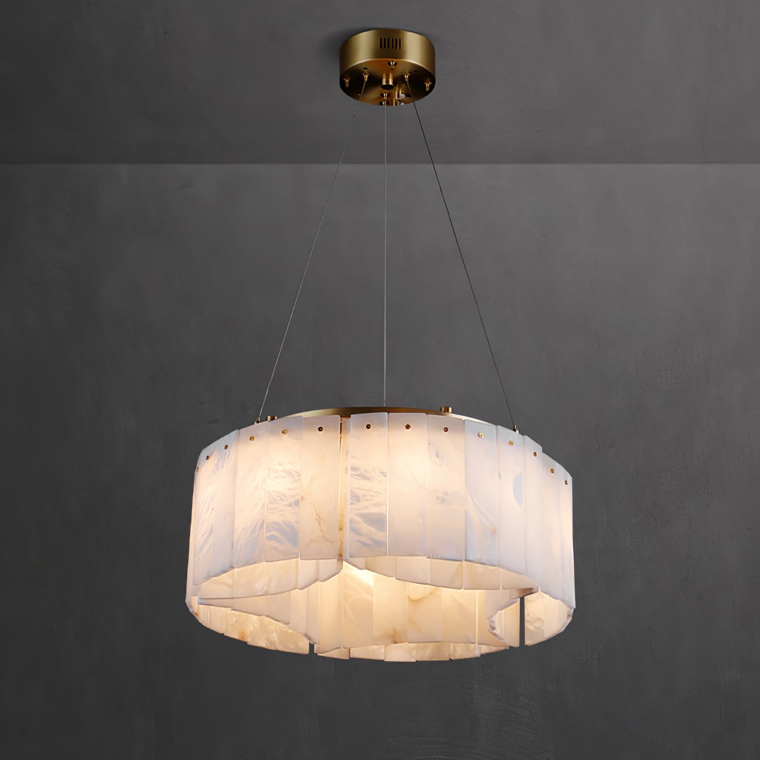 The Velaria Chandelier exudes refined grandeur through cascading alabaster panels, each delicately suspended from a dual-tiered brass frame. Its sculptural silhouette is inspired by classical drapery and celestial harmony, casting a soft, diffused glow reminiscent of moonlight behind silk. Hand-polished and precision-set, this piece brings architectural elegance and timeless luxury to contemporary interiors.