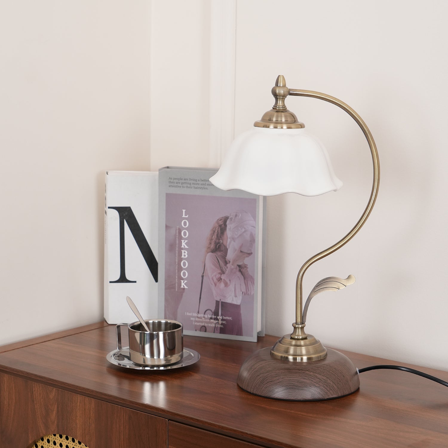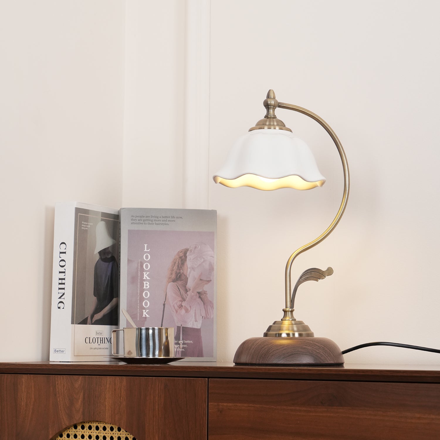 This vintage table lamp will add an elegant touch to any room. The white ceramic flower shade directs light with great precision, making it ideal as a reading lamp, bedside lamp, or study lamp. Crafted from Metal for a timeless look and feel, it provides the perfect light source for any desk or nightstand.