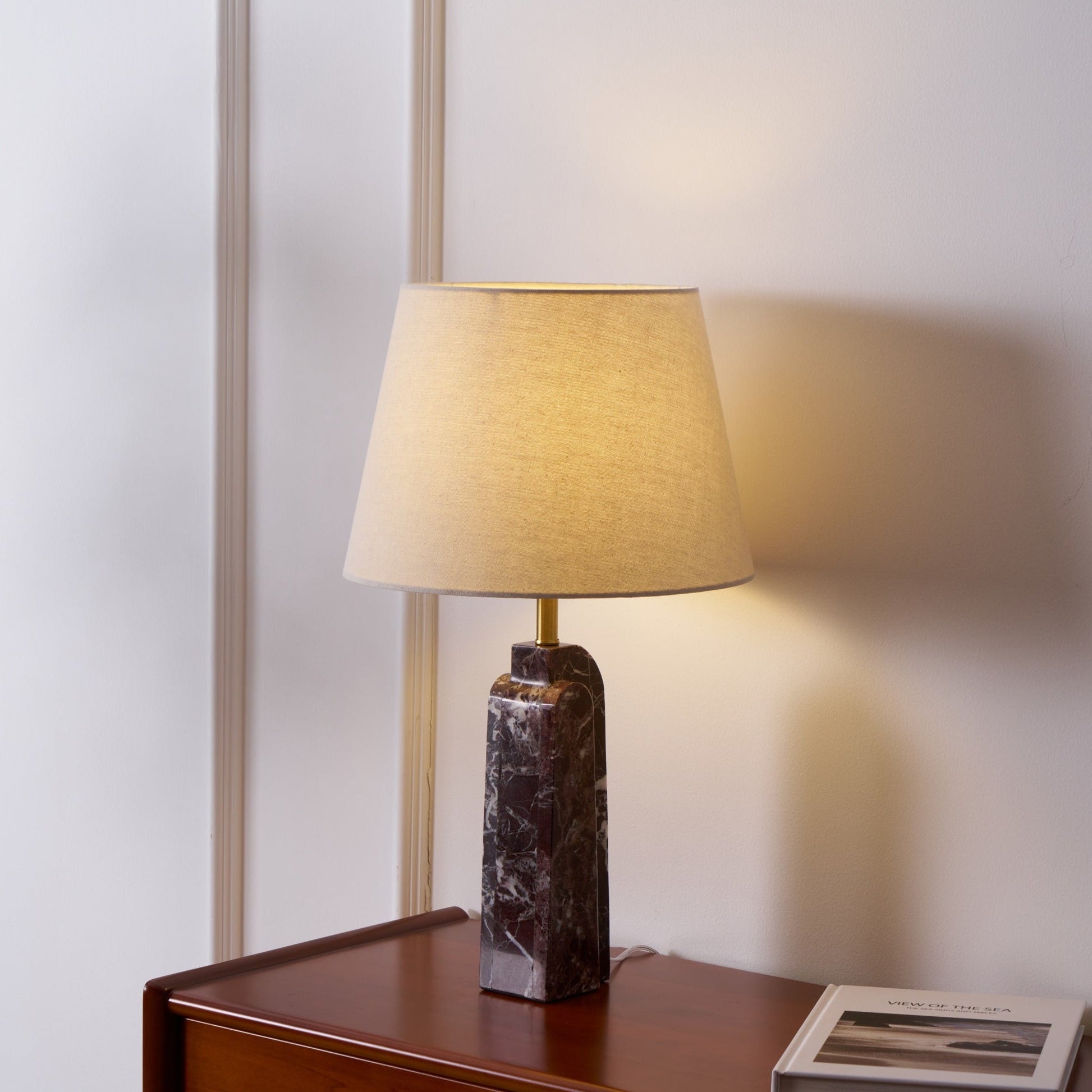 The Virello Marble Table Lamp embodies quiet luxury with its sculptural geometry and refined materials. Featuring a rectangular marble base that beautifully contrasts deep brown and white veining, it’s topped with a warm-toned fabric shade that diffuses light into a soft, inviting glow. Accented with a brass stem, the lamp strikes a balance between classic and contemporary—making it a perfect addition to living rooms, bedrooms, or sophisticated office spaces. A timeless piece designed to elevate any interior.
