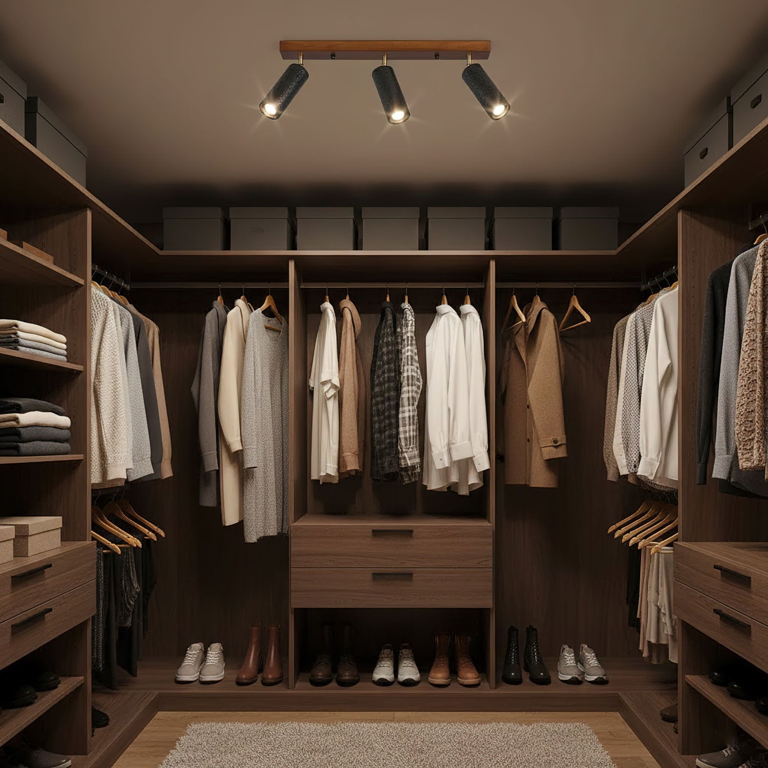 A fusion of raw, organic texture and minimalist modern design, this Triple Spotlight Ceiling Fixture provides targeted, directional illumination with sophisticated style. The fixture is mounted directly to the ceiling on a solid, rectangular Walnut or Teak Wood Bar, showcasing the natural warmth and grain of the timber.